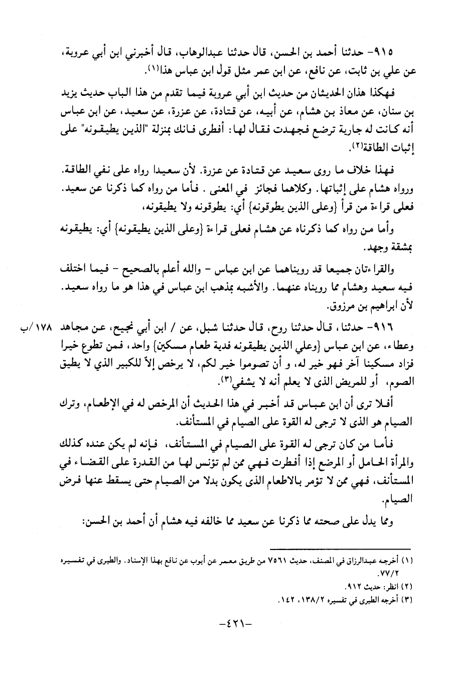 916 - إِبْرَاهِيمُ بْنُ مَرْزُوقٍ حَدَّثَنَا، قَالَ: حَدَّثَنَا رَوْحٌ، قَالَ: حَدَّثَنَا شِبْلٌ، عَنِ ابْنِ أَبِي نَجِيحٍ، عَنْ مُجَاهِدٍ، وَعَطَاءٌ، عَنِ ابْنِ عَبَّاسٍ " {وَعَلَى الَّذِينَ يُطِيقُونَهُ فِدْيَةٌ طَعَامُ مِسْكِينٍ} وَاحِدٍ، {فَمَنْ تَطَوَّعَ خَيْرًا} فَزَادَ مِسْكِينًا آخَرَ {فَهُوَ خَيْرٌ لَهُ وَأَنْ تَصُومُوا خَيْرٌ لَكُمْ} ، لَا يُرَخِّصُ إِلا لِلْكَبِيرِ الَّذِي لَا يُطِيقُ الصَّوْمَ، أَوْ لِلْمَرِيضِ الَّذِي يَعْلَمُ أَنَّهُ لَا يُشْفَى " أَفلا ترى أَن ابْن عَبَّاس قَدْ أخبر فِي هَذَا الحَدِيث أَن المرخص لَهُ فِي الْإِطْعَام، وَترك الصّيام هُوَ الَّذِي لَا ترجى لَهُ الْقُوَّة عَلَى الصّيام فِي المستأنف فأمَّا من كَانَ ترجى لَهُ الْقُوَّة عَلَى الصّيام فِي المستأنف، فَإِنَّهُ لم يكن عِنْده كَذَلِكَ، وَالْمَرْأَة الْحَامِل أَو الْمُرْضع، إِذَا أفطرت فَهِيَ مِمَّنْ لم تؤنس لَهَا من القُدرة عَلَى الْقَضَاء فِي المستأنف، فَهِيَ مِمَّنْ لَا تُؤمر بِالْإِطْعَامِ الَّذين يكون بَدَلا من الصّيام حَتَّى يسْقط عَنْهَا فرض الصّيام وممَّا يدل عَلَى صِحَّته مِمَّا ذكرنَا، عَنْ سعيد مِمَّا خَالفه فِيه هِشَام أَن أَحْمد بن الْحسن