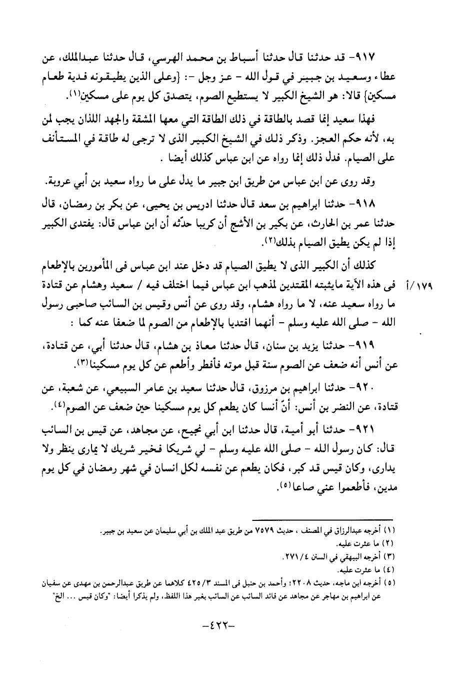 917 - قَدْ حَدَّثَنَا، قَالَ: حَدَّثَنَا أَسْبَاطُ بْنُ مُحَمَّدٍ الهرسي، قَالَ: حَدَّثَنَا عَبْدُ الْمَلِكِ، عَنْ عَطَاءٍ، وَسَعِيدِ بْنِ جُبَيْرٍ، فِي قَوْلِ اللهِ عَزَّ وَجَلَّ: {وَعَلَى الَّذِينَ يُطِيقُونَهُ فِدْيَةٌ طَعَامُ مِسْكِينٍ} ، قَالَ: " هُوَ الشَّيْخُ الْكَبِيرُ لَا يَسْتَطِيعُ الصَّوْمَ، يَتَصَدَّقُ كُلَّ يَوْمٍ عَلَى مِسْكِينٍ " فَهَذَا سعيد إنمَّا قصد بالطاقة فِي ذَلِكَ