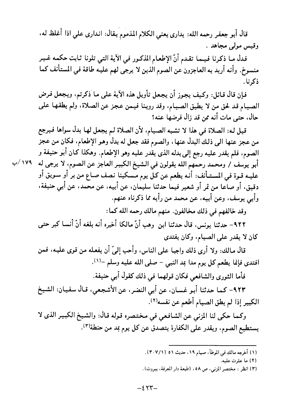 923 - كَمَا حَدَّثَنَا أَبُو غَسَّانَ، عَنْ أَبِي النَّضْرِ، عَنِ الأَشْجَعِيِّ، قَالَ سُفْيَانُ: " الشَّيْخُ الْكَبِيرُ إِذَا لَمْ يُطِقِ الصِّيَامَ أَطْعَمَ عَنْ نَفْسِهِ " وكمَا حكى لنا الْمُزنِيّ، عَنِ الشَّافِعِي فِي مُخْتَصره قَوْله قَالَ: وَالشَّيْخ الْكَبِير الَّذِي لَا يَسْتَطِيع الصَّوْم، وَيقدر عَلَى الْكَفَّارَة يتَصَدَّق عَنْ كل يَوْم بِمد من حِنْطَة