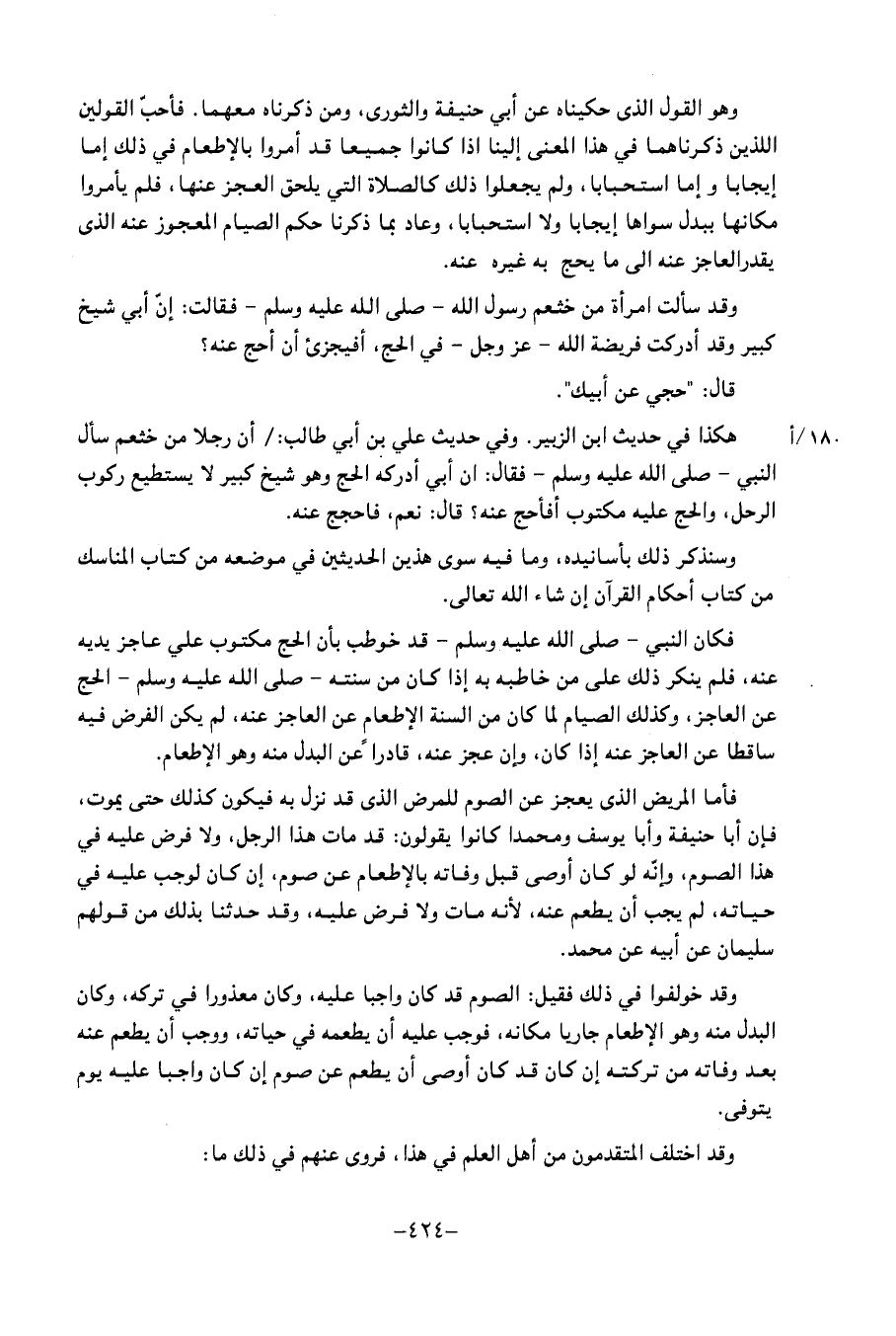 وَلم يجْعَلُوا ذَلِكَ كَالصَّلَاةِ الَّتِي يلْحق الْعَجز عَنْهَا، فَلم يأمروا مكَانَها بِبَدَل سواهَا إِيجَابا، وَلَا اسْتِحْبَابا، وَعَاد بمَا ذكرنَا حكم الصّيام المعجوز عَنهُ الَّذِي يقدر الْعَاجِز عَنهُ إِلَى مَا يحجّ بِهِ غَيره عَنهُ وقَدْ سَأَلت امْرَأَة من خثعم رَسُول اللهِ صَلَّى اللَّهُ عَلَيْهِ وَسَلَّمَ، فقَالَت: إِن أَبِي شيخ كَبِير وقَدْ أدْركْت فَرِيضَة الله عَزَّ وَجَلَّ فِي الْحَج، أفيجزئ أَن أحج عَنهُ؟ قَالَ: " حجي عَنْ أَبِيك " هَكَذَا فِي حَدِيث ابْن الزبير، وفِي حَدِيث عَليّ بن أَبِي طَالب، أَن رجلا من خثعم سَأَلَ النَّبِي صَلَّى اللَّهُ عَلَيْهِ وَسَلَّمَ، فقَالَ: إِن أَبِي أدْركهُ الْحَج وَهُوَ شيخ كَبِير لَا يَسْتَطِيع ركُوب الرحل، وَالْحج عَلَيْهِ مَكْتُوب أفأحج عَنهُ؟ قَالَ: " نعم، فاحجج عَنهُ " وَسَنذكر ذَلِكَ بأسانيده، ومَا فِيه سوى هذَيْن الْحَدِيثين فِي مَوْضِعه من كتاب الْمَنَاسِك من كتاب أَحْكَام الْقُرْآن إِن شَاءَ الله تَعَالَى فكَانَ النَّبِي صَلَّى اللَّهُ عَلَيْهِ وَسَلَّمَ قَدْ خُوطِبَ بِأَن الْحَج مَكْتُوب عَلَى عَاجز يَدَيْهِ عَنهُ، فَلم يُنكر ذَلِكَ عَلَى من خاطبه بِهِ إِذَا كَانَ من سنته، صَلَّى اللَّهُ عَلَيْهِ وَسَلَّمَ، الْحَج عَنِ الْعَاجِز، وكذَلِكَ الصّيام لمَّا كَانَ من السّنة الْإِطْعَام عَنِ الْعَاجِز عَنهُ، لم يكن الْفَرْض فِيه سَاقِطا عَنِ الْعَاجِز عَنهُ إِذَا كَانَ، وَإِن عجز عَنهُ، قَادِرًا عَنِ الْبَدَل مِنْهُ وَهُوَ الْإِطْعَام فأمَّا الْمَرِيض الَّذِي يعجز عَنِ الصَّوْم للمرض الَّذِي قَدْ نزل بِهِ، فَيكون كَذَلِكَ حَتَّى يَمُوت، فَإِن أَبَا حَنِيفَةَ، وَأَبا يُوسُف، ومحمدا كَانُوا يَقُولُونَ: قَدْ مَات هَذَا الرجل