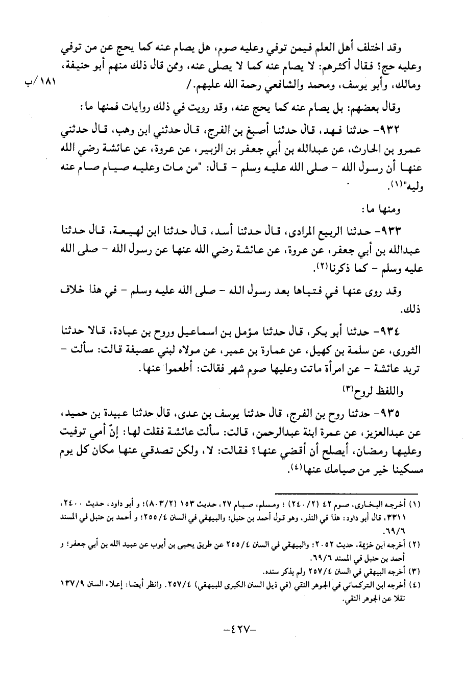 حج؟ فقَالَ أَكْثَرهم: لَا يصام عَنهُ كمَا لَا يصلى عَنهُ، وَمِمَّنْ قَالَ ذَلِكَ مِنْهُمْ: أَبُو حَنِيفَةَ، ومَالك، وَأَبُو يُوسُفَ، وَمُحَمّد، وَالشَّافِعِيّ رَحْمَة الله عَلَيْهِم وقَالَ بَعضهم: بل يصام عَنهُ كمَا يحجّ عَنهُ، وقَدْ رويت فِي ذَلِكَ رِوَايَات فَمِنْهَا مَا