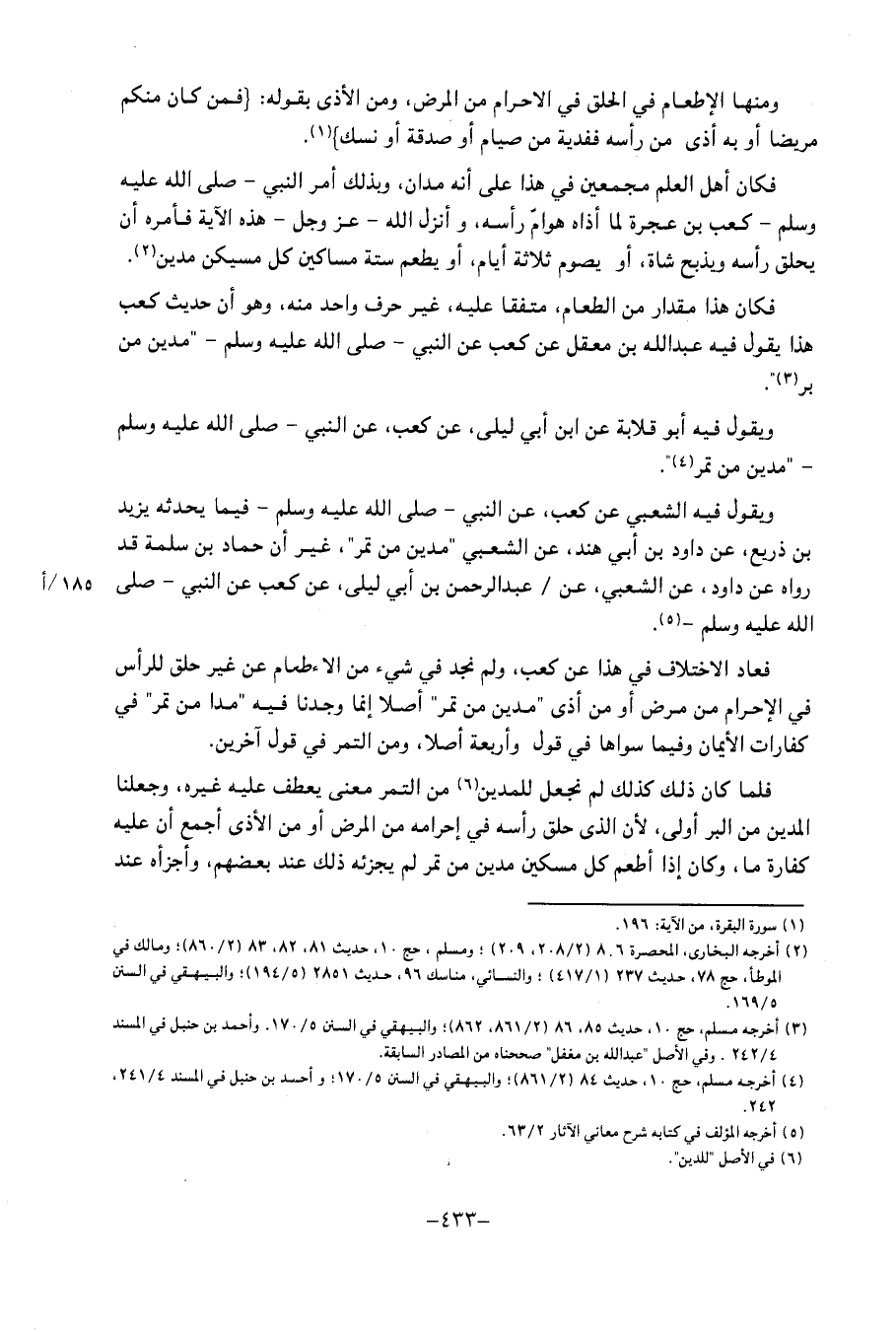 وَمِنْهَا الْإِطْعَام فِي الْحلق فِي الْإِحْرَام من الْمَرَض، وَمن الْأَذَى بقوله: {فَمَنْ كَانَ مِنْكُمْ مَرِيضًا أَوْ بِهِ أَذًى مِنْ رَأْسِهِ فَفِدْيَةٌ مِنْ صِيَامٍ أَوْ صَدَقَةٍ أَوْ نُسُكٍ} فكَانَ أهل الْعلم مُجْمِعِينَ فِي هَذَا عَلَى أَنَّهُ مدان، وبذَلِكَ أَمر النَّبِي صَلَّى اللَّهُ عَلَيْهِ وَسَلَّمَ كَعْب بن عجْرَة لمَّا أَذَاهُ هَوَامُّ رَأسه، وَأنزل الله عَزَّ وَجَلَّ هَذِهِ الْآيَة فَأمره أَن يحلق رَأسه ويذبح شَاة، أَو يَصُوم ثَلَاثَة أَيَّام، أَو يطعم سِتَّة مَسَاكِين كل مِسْكين مَدين فكَانَ هَذَا مِقْدَارًا من الطَّعَام، مُتَّفقا عَلَيْهِ، غير حرف وَاحِد مِنْهُ