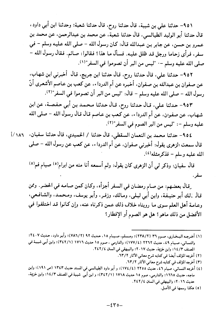 954 - حَدَّثَنَا مُحَمَّدُ بْنُ النُّعْمَانِ السَّقَطِيُّ، قَالَ: حَدَّثَنَا الْحُمَيْدِيُّ، قَالَ: حَدَّثَنَا سُفْيَانُ، قَالَ: سَمِعْتُ الزُّهْرِيَّ، يَقُولُ: أَخْبَرَنِي صَفْوَانُ، عَنْ أُمِّ الدَّرْدَاءِ، عَنْ كَعْبٍ، عَنْ رَسُولِ اللهِ صَلَّى اللَّهُ عَلَيْهِ وَسَلَّمَ، فَذَكَرَ مِثْلَهُ قَالَ سُفْيَانُ: وَذكر لي أَن الزُّهْرِيّ كَانَ يَقُولُ: وَلم أسمعهُ أَنا مِنْهُ من ام برام صِيَام فَم سفر وقَالَ بَعضهم: من صَامَ رَمَضَان فِي السّفر أَجزَأَهُ، وكَانَ كمن صَامَهُ فِي الْحَضَر، وَمِمَّنْ قَالَ ذَلِكَ أَبُو حَنِيفَةَ، وَابْن أَبِي ليلى، ومَالك، وَزفر، وَأَبُو يُوسُفَ، وَمُحَمّد، وَالشَّافِعِيّ، وَعَامة أهل الْعلم سوى مَا روينَاهُ خلاف ذَلِكَ عَمَّن ذَكَرْنَاهُ عَنهُ، وَإِن كَانُوا قَدِ اخْتلفُوا فِي الْأَفْضَل من ذَلِكَ مَا هُوَ؟ هَل هُوَ الصَّوْم أَو الْإِفْطَار؟