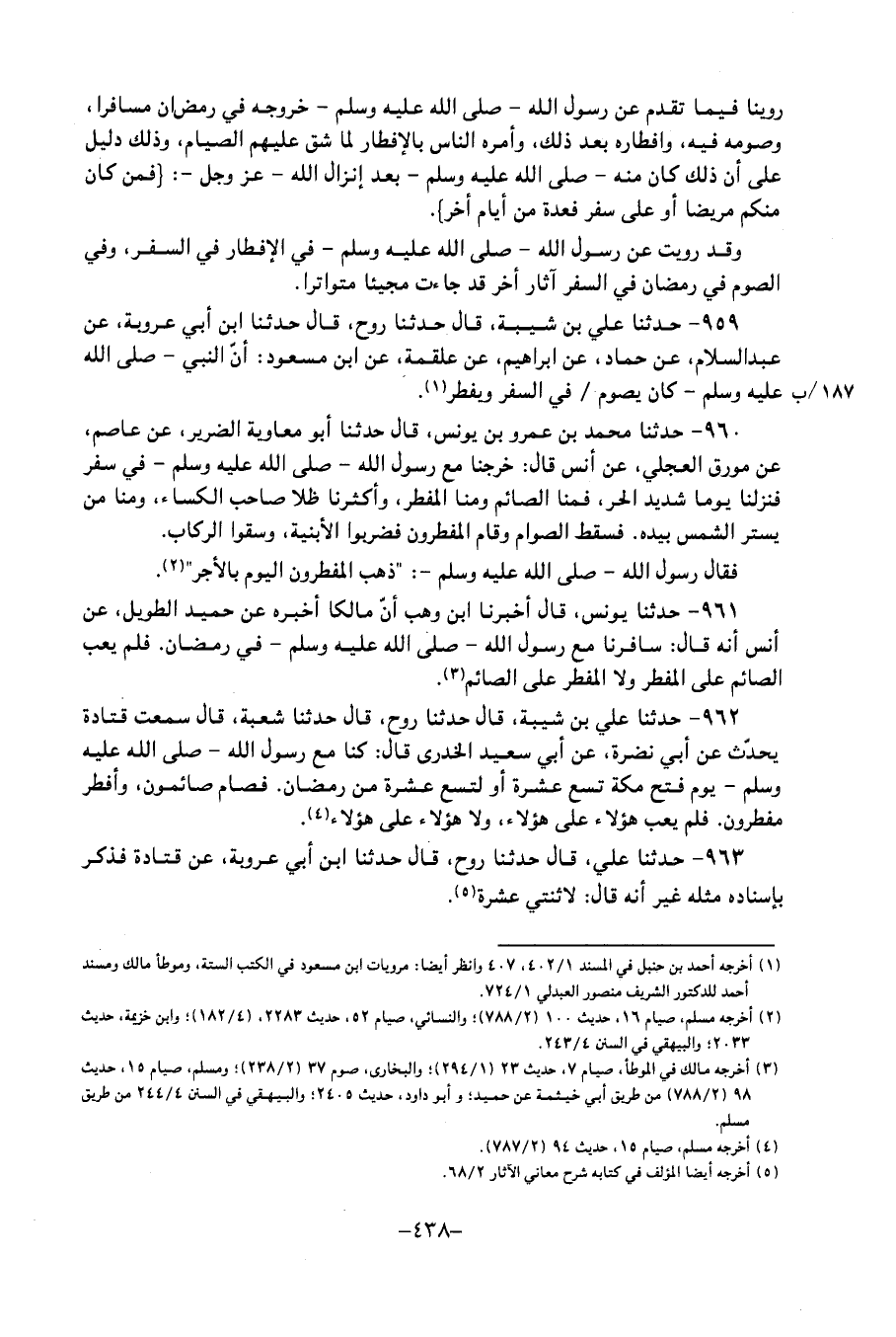 959 - حَدَّثَنَا عَلِيُّ بْنُ شَيْبَةَ، قَالَ: حَدَّثَنَا رَوْحٌ، قَالَ: حَدَّثَنَا ابْنُ أَبِي عَرُوبَةَ، عَنْ عَبْدِ السَّلامِ، عَنْ حَمَّادٍ، عَنْ إِبْرَاهِيمَ، عَنْ عَلْقَمَةَ، عَنِ ابْنِ مَسْعُودٍ: أَنَّ النَّبِيَّ صَلَّى اللَّهُ عَلَيْهِ وَسَلَّمَ كَانَ " يَصُومُ فِي السَّفَرِ وَيُفْطِرُ "
