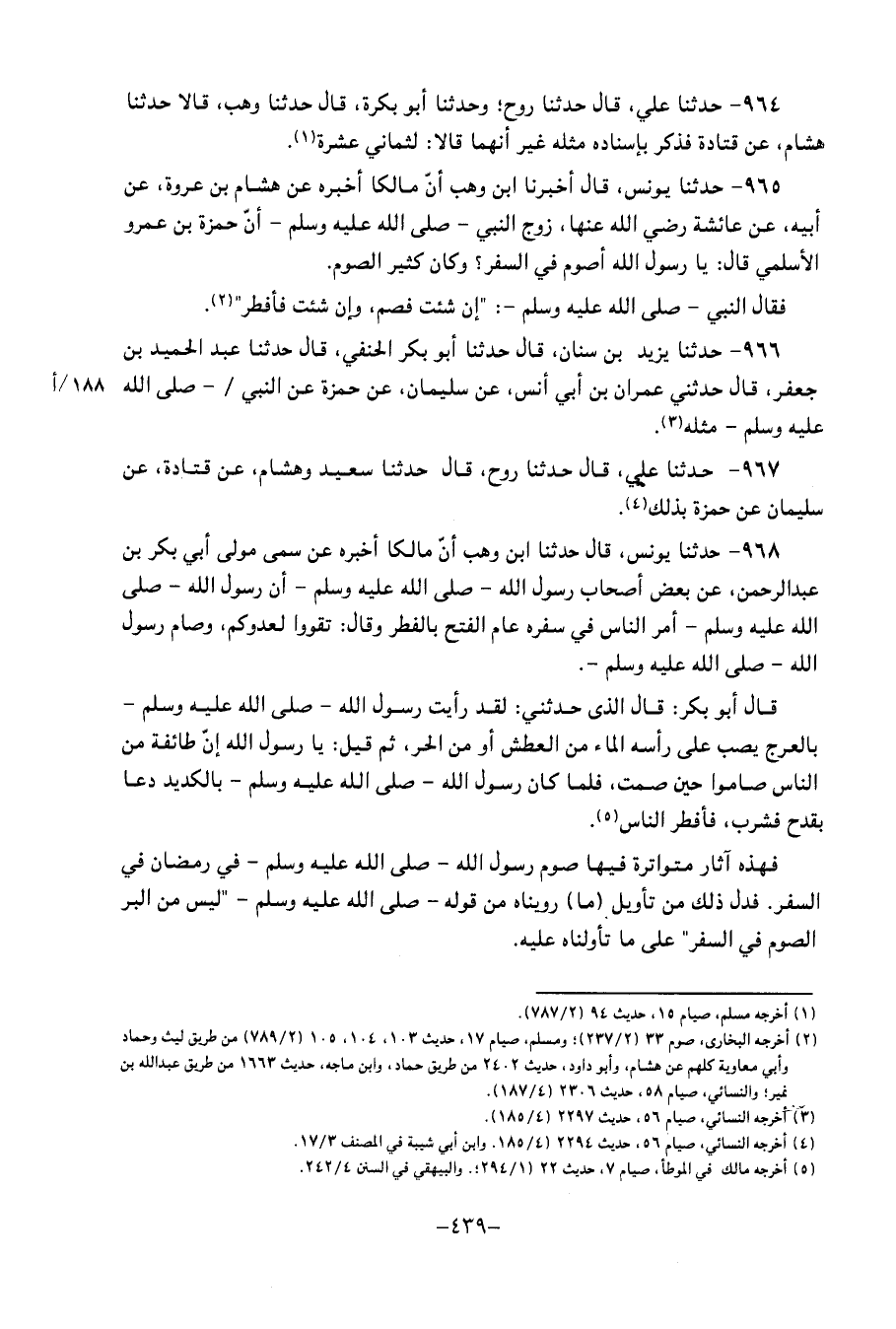 968 - حَدَّثَنَا يُونُسُ، قَالَ: حَدَّثَنَا ابْنُ وَهْبٍ، أَنَّ مَالِكًا أَخْبَرَهُ، عَنْ سَمِيٍّ، مَوْلَى أَبِي بَكْرِ بْنِ عَبْدِ الرَّحْمَنِ، عَنْ بَعْضِ أَصْحَابِ رَسُولِ اللهِ صَلَّى اللَّهُ عَلَيْهِ وَسَلَّمَ، أَنَّ رَسُولَ اللهِ صَلَّى اللَّهُ عَلَيْهِ وَسَلَّمَ، أَمَرَ النَّاسَ فِي سَفَرٍ عَامَ الْفَتْحِ بِالْفِطْرِ وَقَالَ: " تَقَوَّوْا لِعَدُوِّكُمْ "، وَصَامَ رَسُولُ اللهِ صَلَّى اللَّهُ عَلَيْهِ وَسَلَّمَ، قَالَ أَبُو بَكْرٍ: قَالَ الَّذِي حَدَّثَنِي: لَقَدْ رَأَيْتُ رَسُولَ اللهِ صَلَّى اللَّهُ عَلَيْهِ وَسَلَّمَ بِالْعَرَجِ يَصُبُّ عَلَى رَأْسِهِ الْمَاءَ مِنَ الْعَطَشِ أَوْ مِنَ الْحَرِّ، ثُمَّ قِيلَ: يَا رَسُولَ اللهِ، إِنَّ طَائِفَةً مِنَ النَّاسِ صَامُوا حِينَ صُمْتَ، فَلَمَّا كَانَ رَسُولُ اللهِ صَلَّى اللَّهُ عَلَيْهِ وَسَلَّمَ بِالْكَدِيدِ " دَعَا بِقَدَحٍ فَشَرِبَ، فَأَفْطَرَ النَّاسُ " فَهَذِهِ آثَارٌ مُتَوَاتِرَةٌ فِيهَا صَوْمُ رَسُولِ اللهِ صَلَّى اللَّهُ عَلَيْهِ وَسَلَّمَ فِي رَمَضَانَ فِي السَّفَرِ، فَدَلَّ ذَلِكَ مِنْ تَأْوِيلِ مَا رَوَيْنَاهُ مِنْ قَوْلِهِ صَلَّى اللَّهُ عَلَيْهِ وَسَلَّمَ: " لَيْسَ مِنَ الْبِرِّ الصَّوْمُ فِي السَّفَرِ "، عَلَى مَا تَأَوَّلْنَاهُ عَلَيْهِ