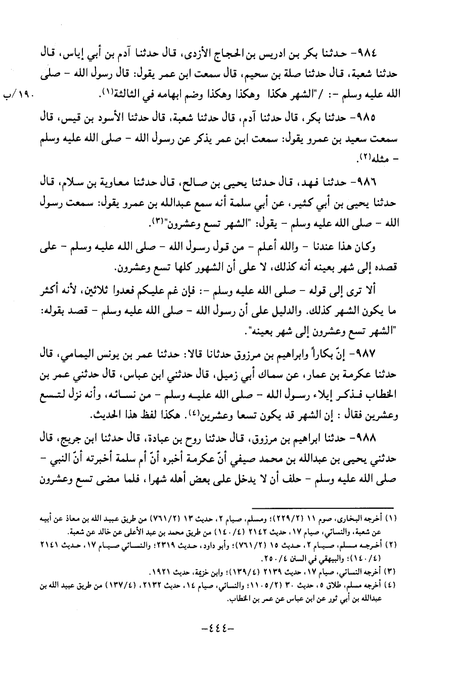 986 - حَدَّثَنَا فَهْدٌ، قَالَ: حَدَّثَنَا يَحْيَى بْنُ صَالِحٍ، قَالَ: حَدَّثَنَا مُعَاوِيَةُ بْنُ سَلامٍ، قَالَ: حَدَّثَنَا يَحْيَى بْنُ أَبِي كَثِيرٍ، عَنْ أَبِي سَلَمَةَ، أَنَّهُ سَمِعَ عَبْدَ اللهِ بْنَ عَمْرٍو، يَقُولُ: سَمِعْتُ رَسُولَ اللهِ صَلَّى اللَّهُ عَلَيْهِ وَسَلَّمَ، يَقُولُ: " الشَّهْرُ تِسْعٌ وَعِشْرُونَ " وكَانَ هَذَا عِنْدَنَا وَالله أعلم من قَول رَسُول اللهِ صَلَّى اللَّهُ عَلَيْهِ وَسَلَّمَ عَلَى قَصده إِلَى شهر بِعَيْنِه أَنَّهُ كَذَلِكَ، لَا عَلَى أَن الشُّهُور كلهَا تسع وَعِشْرُونَ أَلا ترى إِلَى قَوْله صَلَّى اللَّهُ عَلَيْهِ وَسَلَّمَ: "