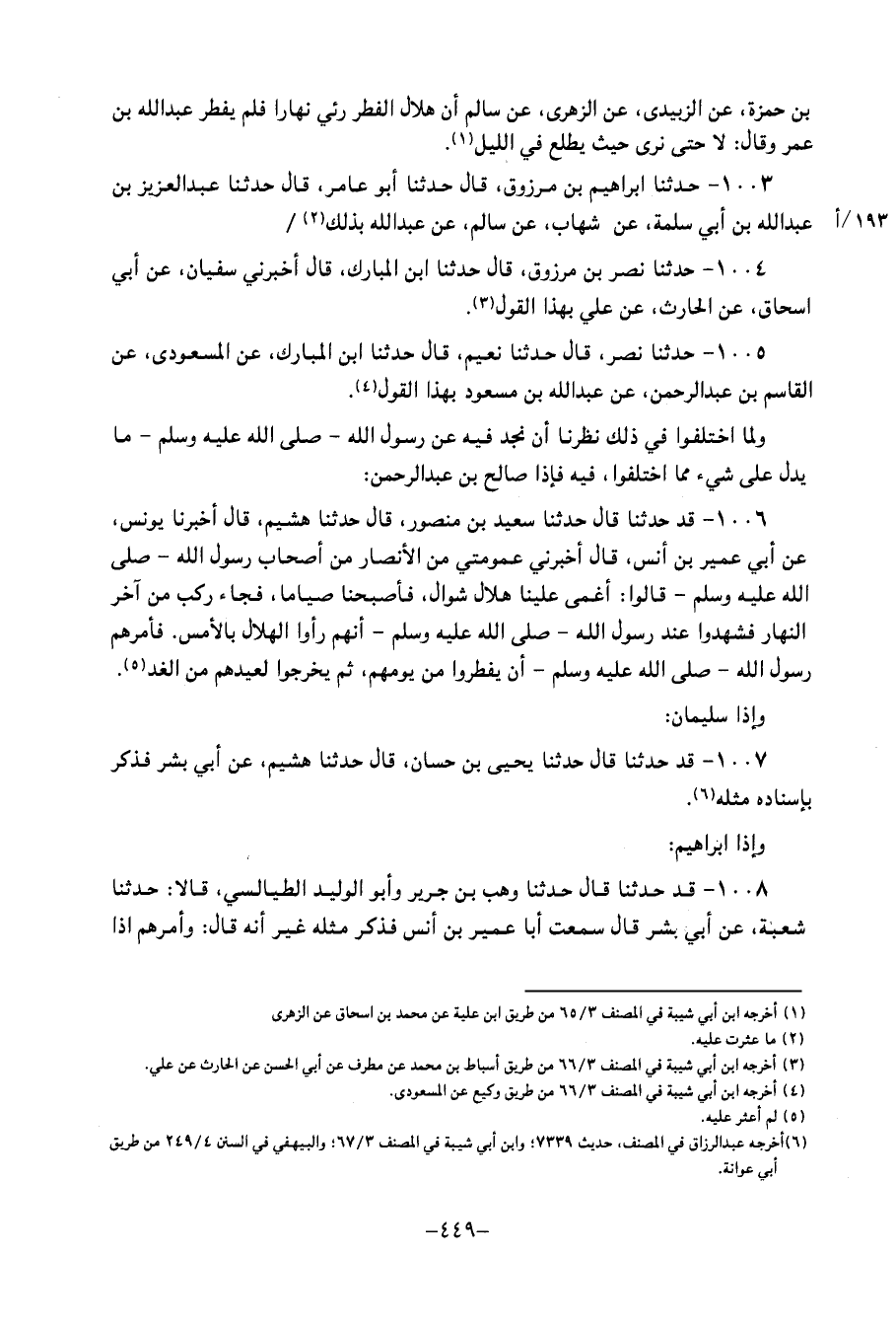 1006 - فإِذَا صَالِحُ بْنُ عَبْدِ الرَّحْمَنِ قَدْ حَدَّثَنَا، قَالَ: حَدَّثَنَا سَعِيدُ بْنُ مَنْصُورٍ، قَالَ: حَدَّثَنَا هُشَيْمٌ، قَالَ: أَخْبَرَنَا يُونُسُ، عَنْ أَبِي عُمَيْرِ بْنِ أَنَسٍ، قَالَ: أَخْبَرَنِي عُمُومَتِي مِنَ الأَنْصَارِ مِنْ أَصْحَابِ رَسُولِ اللهِ صَلَّى اللَّهُ عَلَيْهِ وَسَلَّمَ، قَالُوا: " أُغْمِيَ عَلَيْنَا هِلالُ شَوَّالٍ، فَأَصْبَحْنَا صِيَامًا، فَجَاءَ رَكْبٌ مِنْ آخِرِ النَّهَارِ، فَشَهِدُوا عِنْدَ رَسُولِ اللهِ صَلَّى اللَّهُ عَلَيْهِ وَسَلَّمَ أَنَّهُمْ رَأَوُا الْهِلالَ بِالأَمْسِ، فَأَمَرَهُمْ رَسُولُ اللهِ صَلَّى اللَّهُ عَلَيْهِ وَسَلَّمَ أَنْ يُفْطِرُوا مِنْ يَوْمِهِمْ، ثُمَّ يَخْرُجُوا لِعِيدِهِمْ مِنَ الْغَدِ " وإِذَا سليمَان