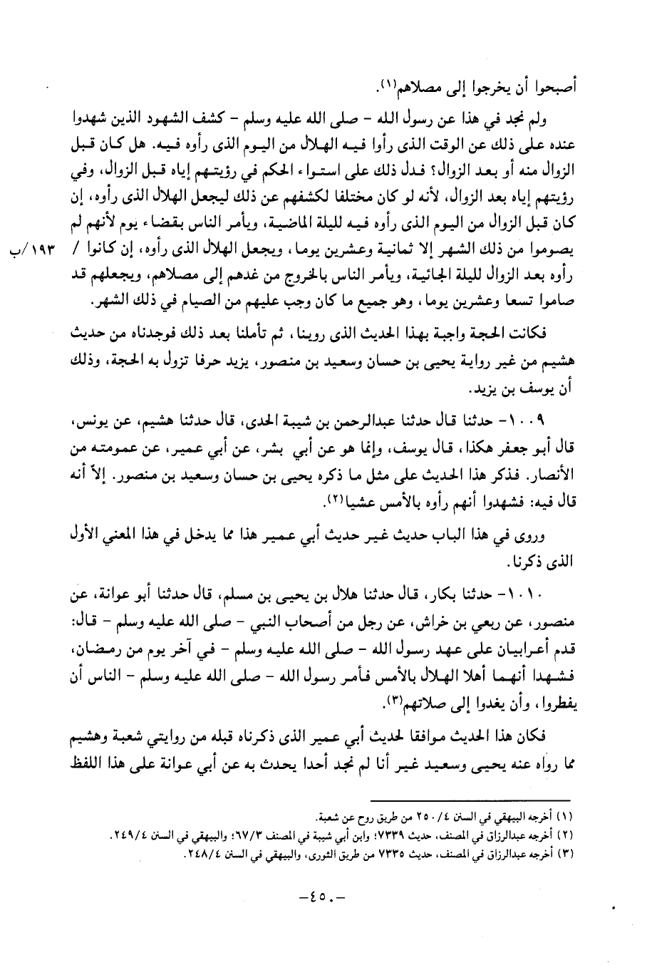 يَوْم، لأَنهم لم يَصُومُوا من ذَلِكَ الشَّهْر إِلَّا ثمَانية وَعشْرين يَوْمًا، وَيجْعَل الْهلَال الَّذِي رَأَوْهُ، إِن كَانُوا رَأَوْهُ بعد الزَّوَال لليلة الجائية، وَيَأْمُر النَّاس بِالْخرُوجِ من غدهم إِلَى مصلاهم، ويجعلهم قَدْ صَامُوا تسعا وَعشْرين يَوْمًا، وَهُوَ جَمِيع مَا كَانَ وَجب عَلَيْهِم من الصّيام فِي ذَلِكَ الشَّهْر فكَانَت الْحجَّة وَاجِبَة بِهَذَا الحَدِيث الَّذِي روينَا، ثُمَّ تأملنا بعد ذَلِكَ فوجدناه من حَدِيث هشيم من غير رِوَايَة يَحْيَى بن حسان، وَسَعِيد بن مَنْصُور، يزِيد حرفا تَزُول بِهِ الْحجَّة، وَذَلِكَ أَن يُوسُف بن يزِيد