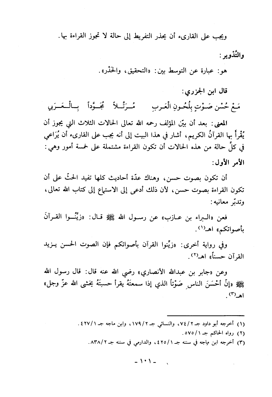 المعنى: بعد أن بيّن المؤلف رحمه الله تعالى الحالات الثلاث التي يجوز أن يقرأ بها القرآن الكريم، أشار في هذا البيت إلى أنه يجب على القارئ أن يراعي في كلّ حالة من هذه الحالات أن تكون القراءة مشتملة على خمسة أمور وهي: