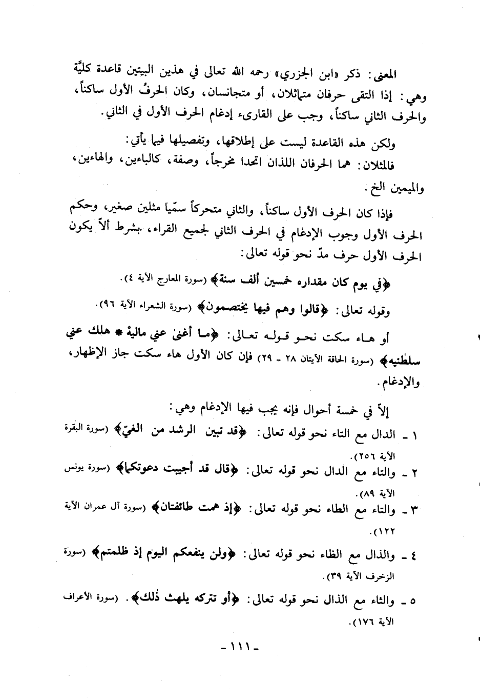 المعنى: ذكر «ابن الجزري» رحمه الله تعالى في هذين البيتين قاعدة كليّة وهي: إذا التقى حرفان متماثلان، أو متجانسان، وكان الحرف الأول ساكنا، والحرف الثاني ساكنا، وجب على القارئ إدغام الحرف الأول في الثاني.