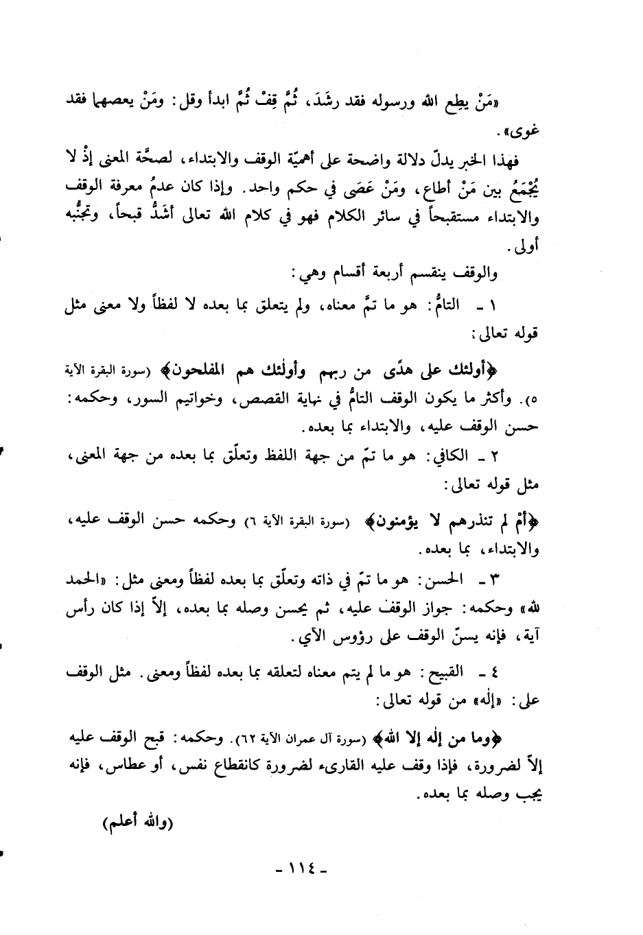 أُولئِكَ عَلى هُدىً مِنْ رَبِّهِمْ وَأُولئِكَ هُمُ الْمُفْلِحُونَ (سورة البقرة الآية 5). وأكثر ما يكون الوقف التامّ في نهاية القصص، وخواتيم السور، وحكمه: