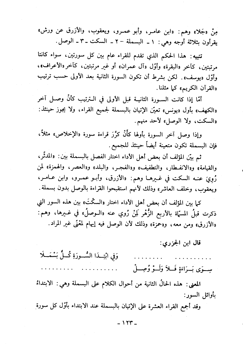 تنبيه: هذا الحكم الذي تقدم للقراء عام بين كل سورتين، سواء كانتا مرتبتين، كآخر «البقرة» وأوّل «آل عمران» أو غير مرتبتين، كآخر «الأعراف»، وأوّل «يوسف». لكن بشرط أن تكون السورة الثانية بعد الأولى حسب ترتيب «القرآن الكريم» كما مثلنا.