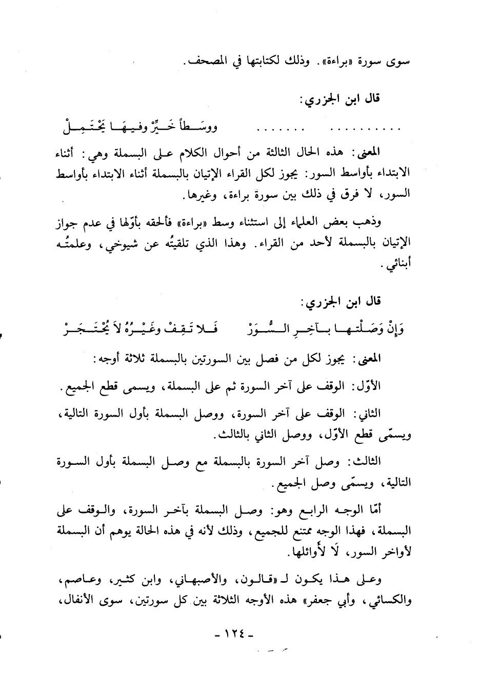 وذهب بعض العلماء إلى استثناء وسط «براءة» فألقحه بأوّلها في عدم جواز الإتيان بالبسملة لأحد من القراء. وهذا الذي تلقيته عن شيوخي، وعلمته أبنائي.