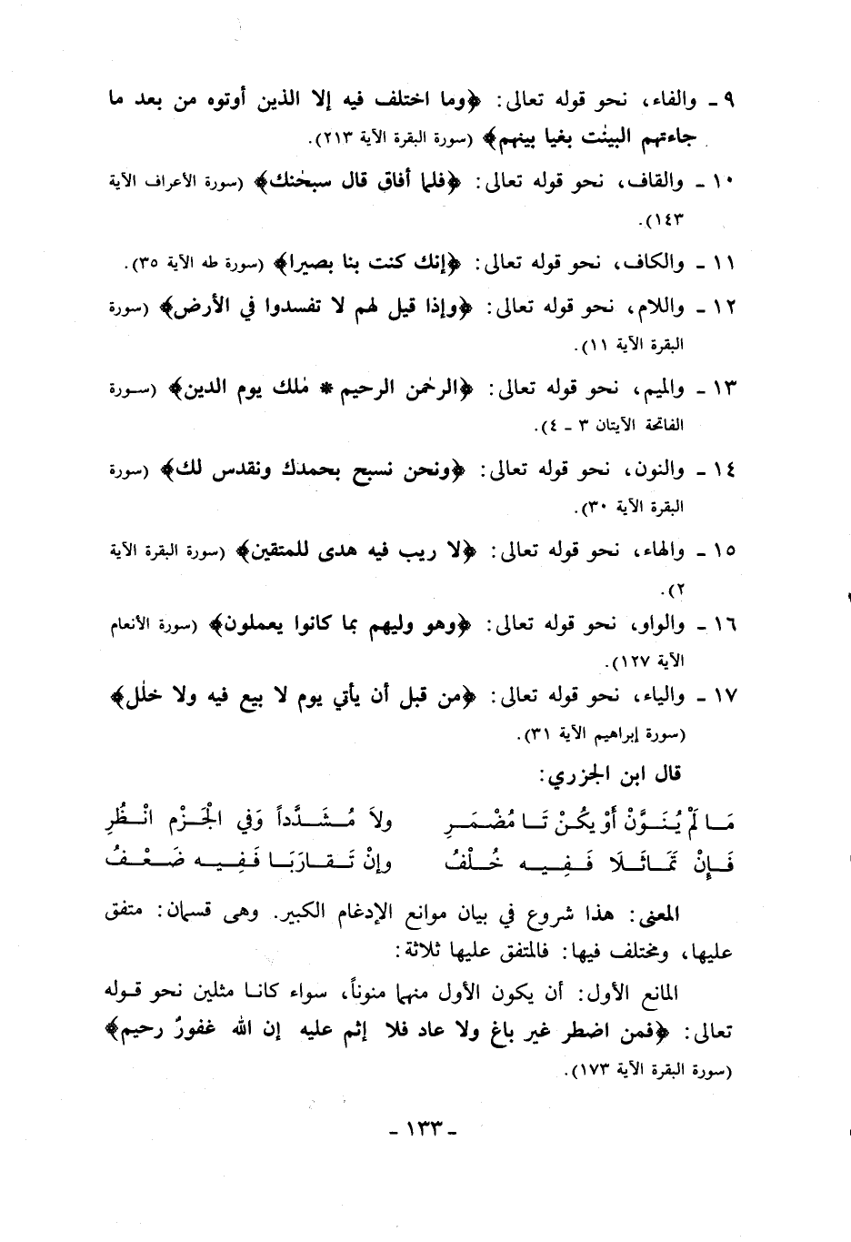 13 - والميم، نحو قوله تعالى: الرَّحْمنِ الرَّحِيمِ* مالِكِ يَوْمِ الدِّينِ (سورة الفاتحة الآيتان 3 - 4).