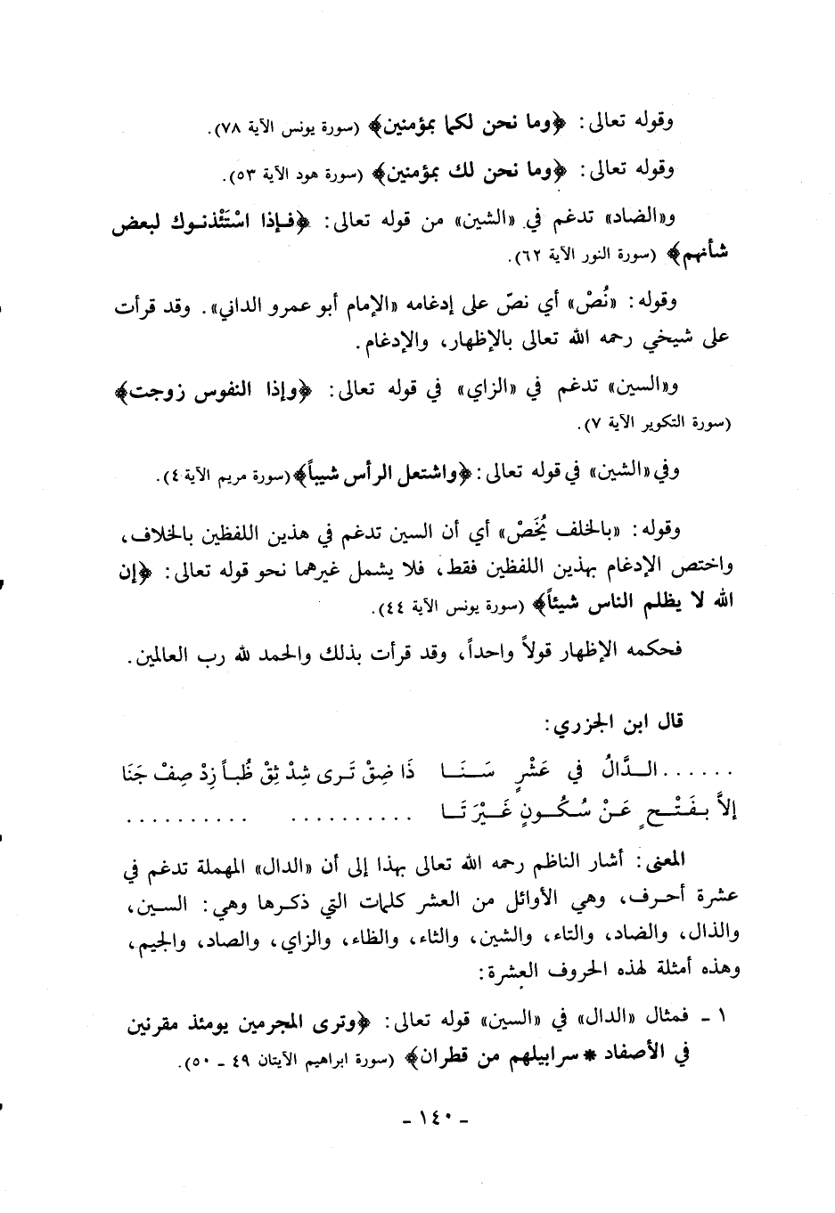 و «الضاد» تدغم في «الشين» من قوله تعالى: فَإِذَا اسْتَأْذَنُوكَ لِبَعْضِ شَأْنِهِمْ (سورة النور الآية 62).