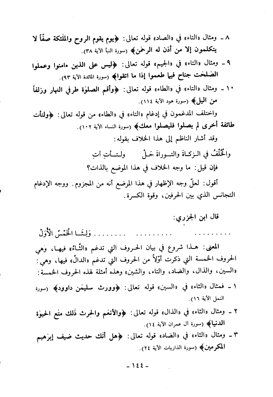 10 - ومثال «التاء» في «الطاء» قوله تعالى: وَأَقِمِ الصَّلاةَ طَرَفَيِ النَّهارِ وَزُلَفاً مِنَ اللَّيْلِ (سورة هود الآية 114).