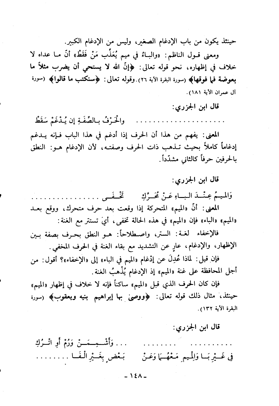 ومعنى قول الناظم: «والباء في ميم يعذّب من فقط» أنّ ما عداه لا خلاف في إظهاره، نحو قوله تعالى: إِنَّ اللَّهَ لا يَسْتَحْيِي أَنْ يَضْرِبَ مَثَلًا ما بَعُوضَةً فَما فَوْقَها (سورة البقرة الآية 26). وقوله تعالى: سَنَكْتُبُ ما قالُوا (سورة آل عمران الآية 181).