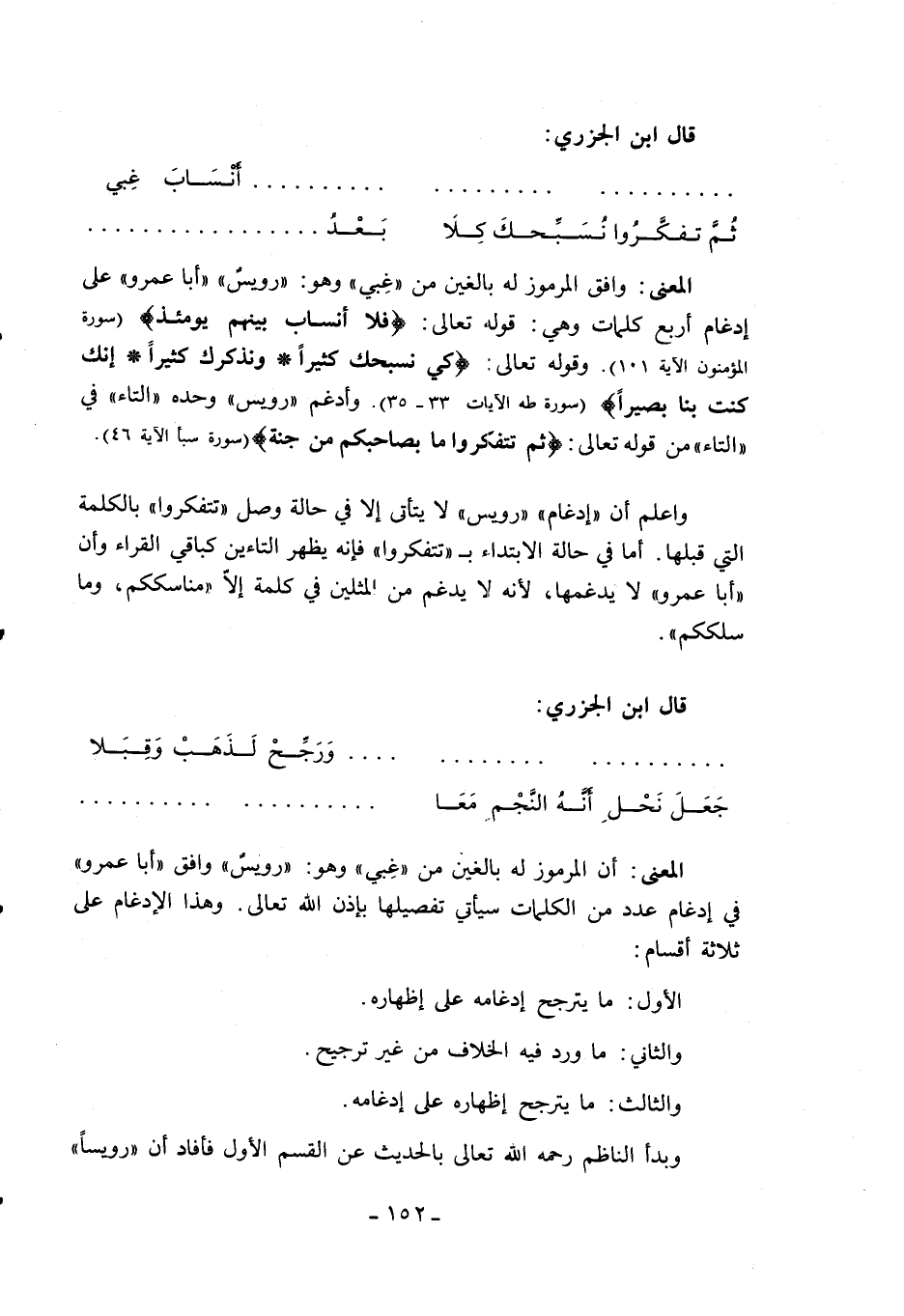 المعنى: وافق المرموز له بالغين من «غبي» وهو: «رويس» «أبا عمرو» على إدغام أربع كلمات وهي: قوله تعالى: فَلا أَنْسابَ بَيْنَهُمْ يَوْمَئِذٍ (سورة المؤمنون الآية 101). وقوله تعالى: كَيْ نُسَبِّحَكَ كَثِيراً* وَنَذْكُرَكَ كَثِيراً* إِنَّكَ كُنْتَ بِنا بَصِيراً (سورة طه الآيات 33 - 35). وأدغم «رويس» وحده «التاء» في «التاء» من قوله تعالى: ثُمَّ تَتَفَكَّرُوا ما بِصاحِبِكُمْ مِنْ جِنَّةٍ (سورة سبأ الآية 46).