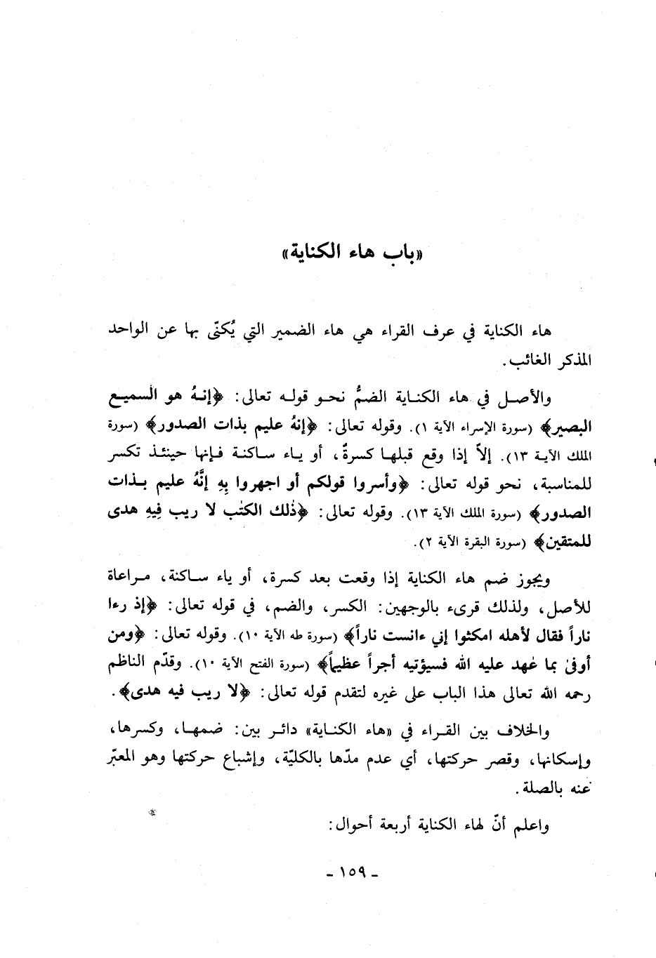 ويجوز ضم هاء الكناية إذا وقعت بعد كسرة، أو ياء ساكنة، مراعاة للأصل، ولذلك قرئ بالوجهين: الكسر، والضم، في قوله تعالى: إِذْ رَأى ناراً فَقالَ لِأَهْلِهِ امْكُثُوا إِنِّي آنَسْتُ ناراً (سورة طه الآية 10). وقوله تعالى: وَمَنْ أَوْفى بِما عاهَدَ عَلَيْهُ اللَّهَ فَسَيُؤْتِيهِ أَجْراً عَظِيماً (سورة الفتح الآية 10). وقدّم الناظم رحمه الله تعالى هذا الباب على غيره لتقدم قوله تعالى: لا رَيْبَ فِيهِ هُدىً.