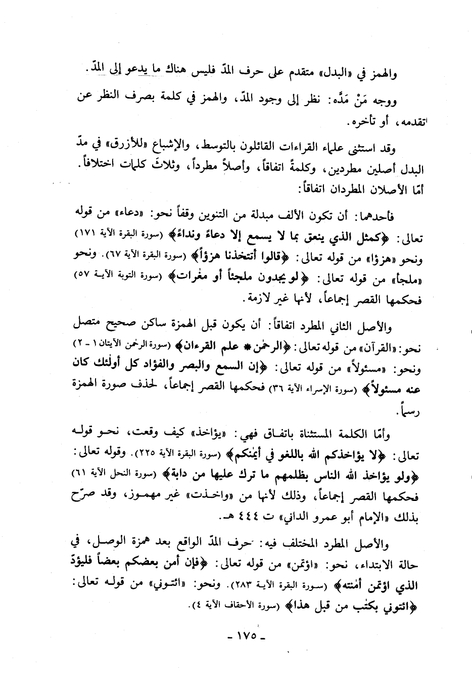 والأصل الثاني المطرد اتفاقا: أن يكون قبل الهمزة ساكن صحيح متصل نحو: «القرآن» من قوله تعالى: الرَّحْمنُ* عَلَّمَ الْقُرْآنَ (سورة الرحمن الآيتان 1 - 2) ونحو: «مسئولا» من قوله تعالى: إِنَّ السَّمْعَ وَالْبَصَرَ وَالْفُؤادَ كُلُّ أُولئِكَ كانَ عَنْهُ مَسْؤُلًا (سورة الإسراء الآية 36) فحكمها القصر إجماعا، لحذف صورة الهمزة رسما.