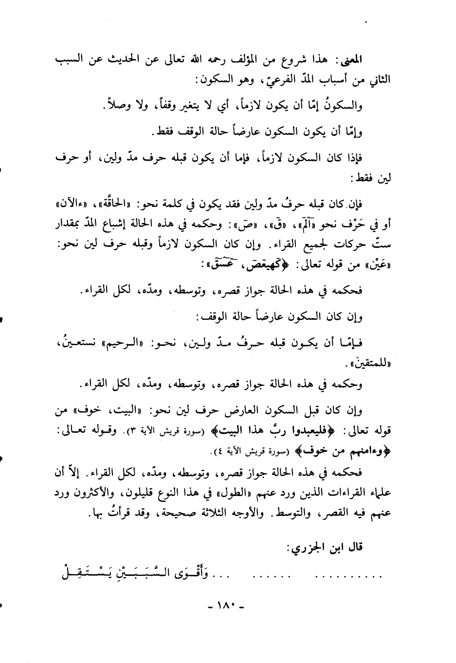 وإن كان قبل السكون العارض حرف لين نحو: «البيت، خوف» من قوله تعالى: فَلْيَعْبُدُوا رَبَّ هذَا الْبَيْتِ (سورة قريش الآية 3). وقوله تعالى: