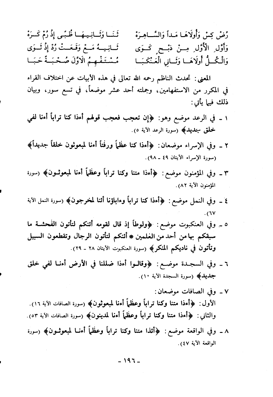 المعنى: تحدث الناظم رحمه الله تعالى في هذه الأبيات عن اختلاف القراء في المكرر من الاستفهامين، وجملته أحد عشر موضعا، في تسع سور، وبيان ذلك فيما يأتي: