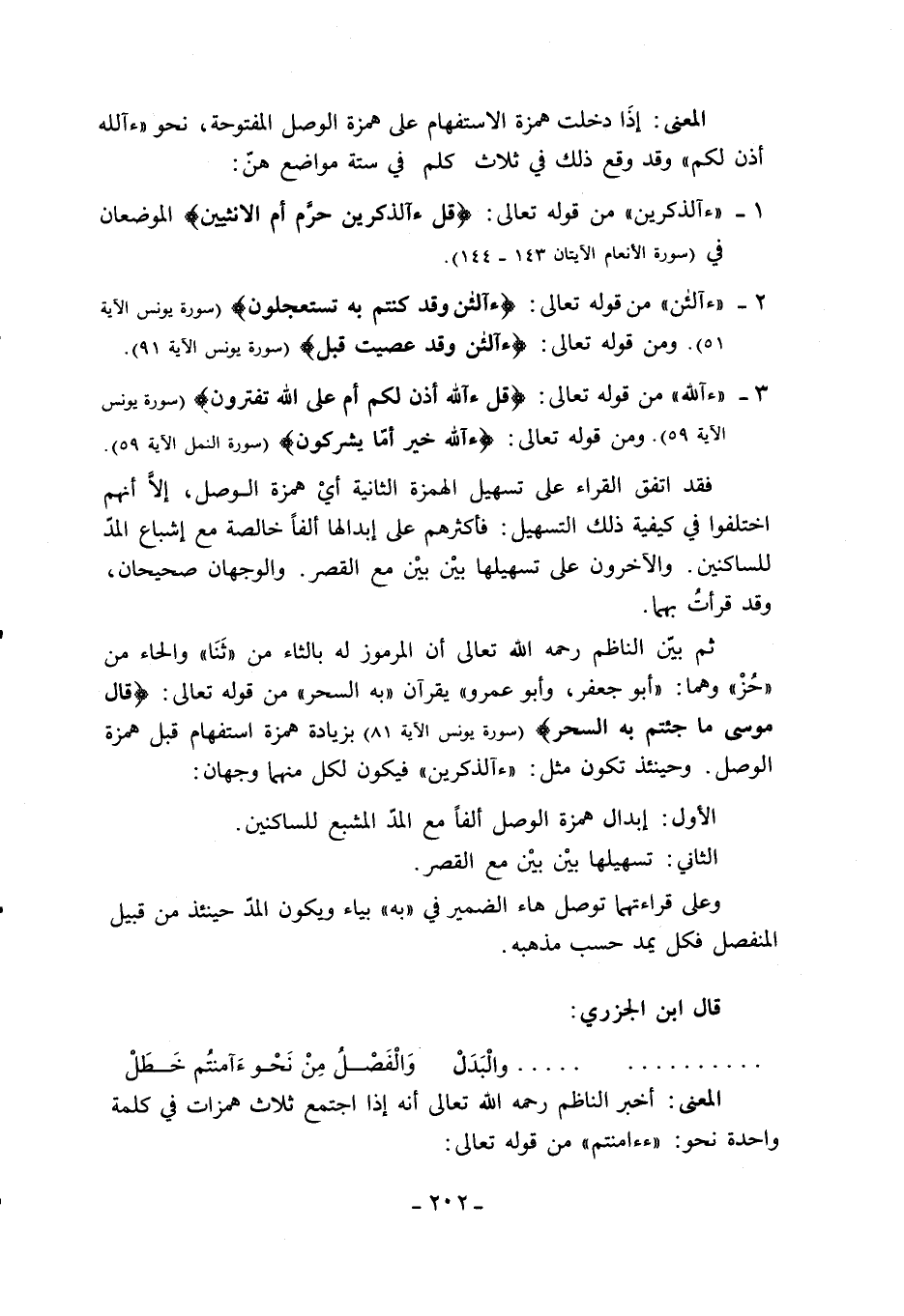 ثم بيّن الناظم رحمه الله تعالى أن المرموز له بالثاء من «ثنا» والحاء من «حز» وهما: «أبو جعفر، وأبو عمرو» يقرءان «به السحر» من قوله تعالى: قالَ مُوسى ما جِئْتُمْ بِهِ السِّحْرُ (سورة يونس الآية 81) بزيادة همزة استفهام قبل همزة الوصل. وحينئذ تكون مثل: «ءآلذكرين» فيكون لكل منهما وجهان: