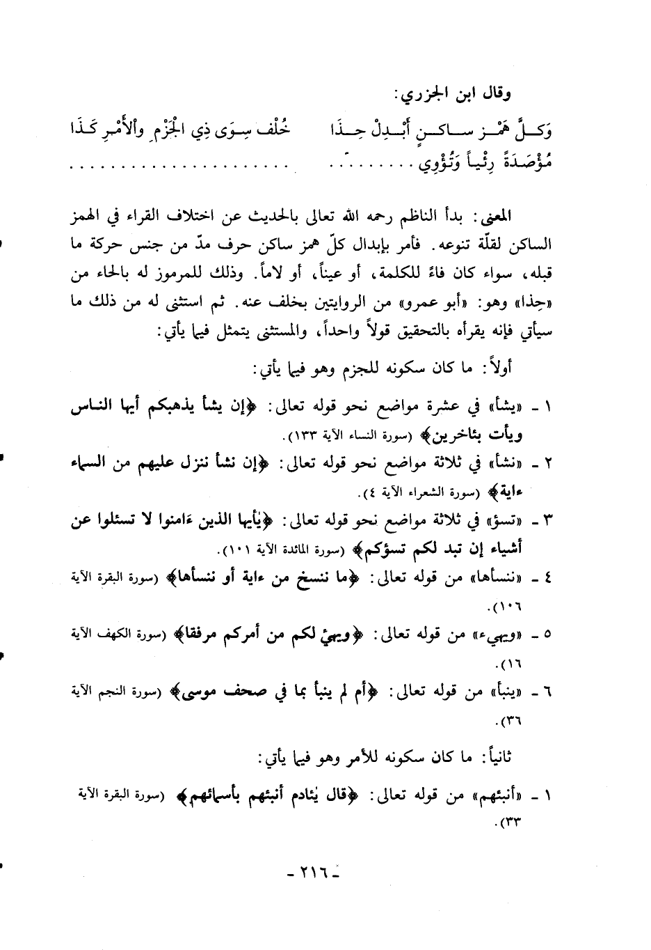 المعنى: بدأ الناظم رحمه الله تعالى بالحديث عن اختلاف القراء في الهمز الساكن لقلّة تنوعه. فأمر بإبدال كلّ همز ساكن حرف مدّ من جنس حركة ما قبله، سواء كان فاء للكلمة، أو عينا، أو لاما. وذلك للمرموز له بالحاء من «حذا» وهو: «أبو عمرو» من الروايتين بخلف عنه. ثم استثنى له من ذلك ما سيأتي فإنه يقرأه بالتحقيق قولا واحدا، والمستثنى يتمثل فيما يأتي: