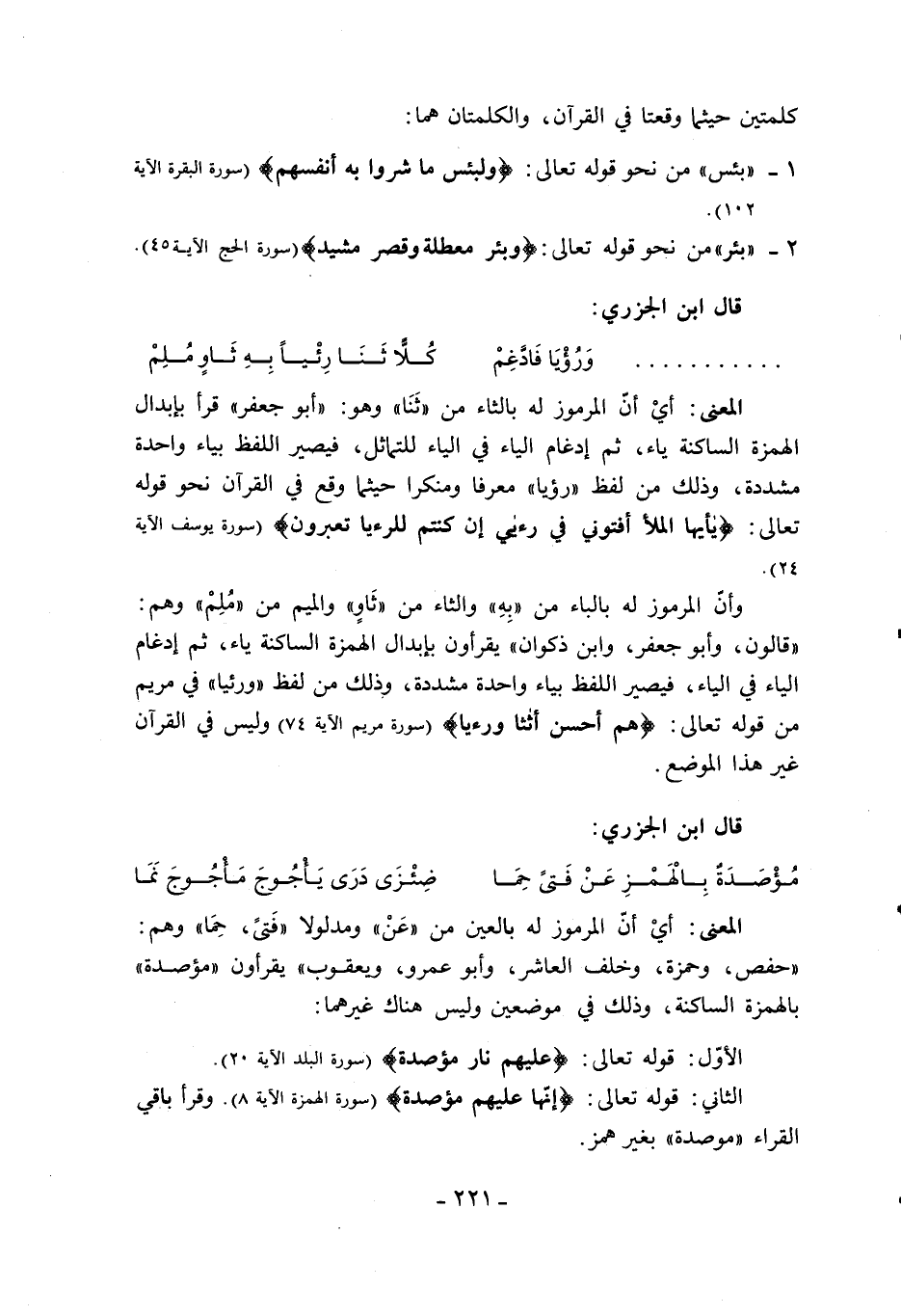 المعنى: أي أنّ المرموز له بالثاء من «ثنا» وهو: «أبو جعفر» قرأ بإبدال الهمزة الساكنة ياء، ثم إدغام الياء في الياء للتماثل، فيصير اللفظ بياء واحدة مشددة، وذلك من لفظ «رؤيا» معرفا ومنكرا حيثما وقع في القرآن نحو قوله تعالى: يا أَيُّهَا الْمَلَأُ أَفْتُونِي فِي رُءْيايَ إِنْ كُنْتُمْ لِلرُّءْيا تَعْبُرُونَ (سورة يوسف الآية 24).