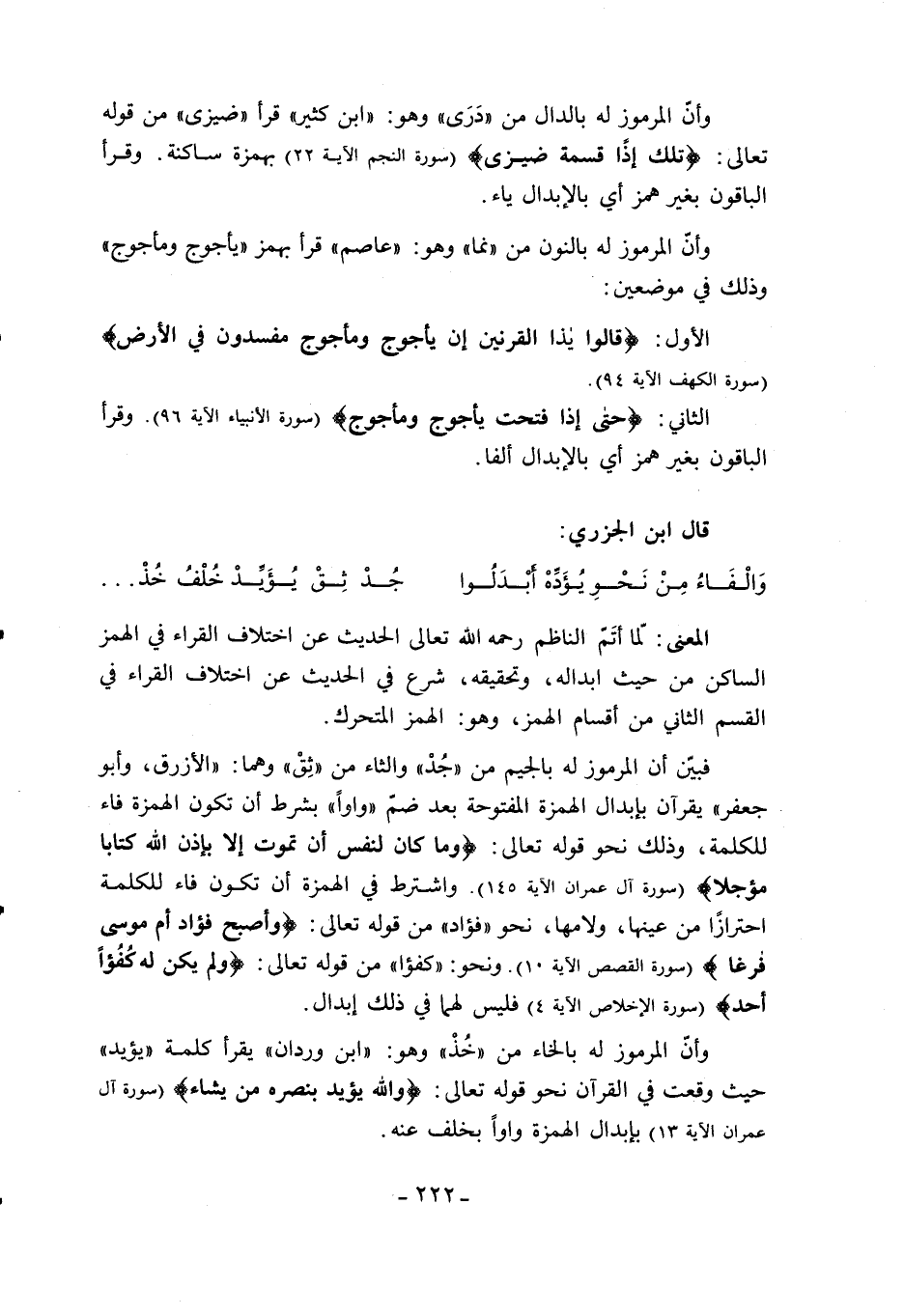 فبيّن أن المرموز له بالجيم من «جد» والثاء من «ثق» وهما: «الأزرق، وأبو جعفر» يقرءان بإبدال الهمزة المفتوحة بعد ضمّ «واوا» بشرط أن تكون الهمزة فاء للكلمة، وذلك نحو قوله تعالى: وَما كانَ لِنَفْسٍ أَنْ تَمُوتَ إِلَّا بِإِذْنِ اللَّهِ كِتاباً مُؤَجَّلًا (سورة آل عمران الآية 145). واشترط في الهمزة أن تكون فاء للكلمة احترازا من عينها، ولامها، نحو «فؤاد» من قوله تعالى: وَأَصْبَحَ فُؤادُ أُمِّ مُوسى فارِغاً (سورة القصص الآية 10). ونحو: «كفؤا» من قوله تعالى: وَلَمْ يَكُنْ لَهُ كُفُواً أَحَدٌ (سورة الإخلاص الآية 4) فليس لهما في ذلك إبدال.