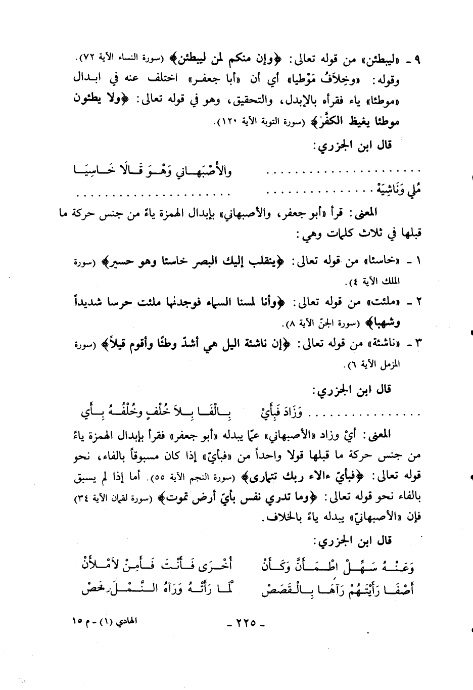 وقوله: «وخلاف موطيا» أي أن «أبا جعفر» اختلف عنه في ابدال «موطئا» ياء فقرأه بالإبدال، والتحقيق، وهو في قوله تعالى: وَلا يَطَؤُنَ مَوْطِئاً يَغِيظُ الْكُفَّارَ (سورة التوبة الآية 120).