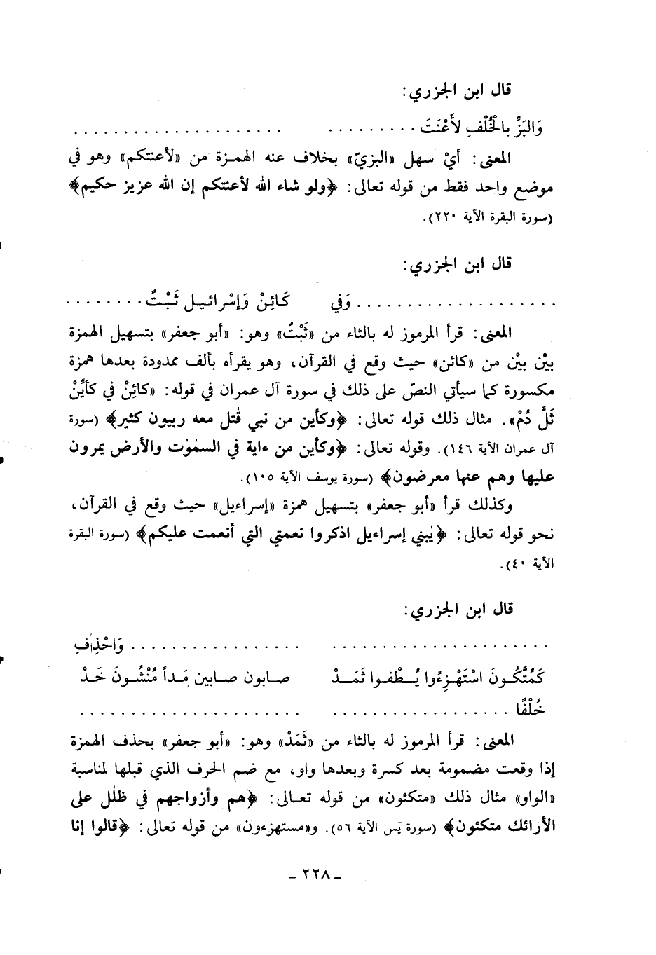 المعنى: قرأ المرموز له بالثاء من «ثبت» وهو: «أبو جعفر» بتسهيل الهمزة بين بين من «كائن» حيث وقع في القرآن، وهو يقرأه بألف ممدودة بعدها همزة مكسورة كما سيأتي النصّ على ذلك في سورة آل عمران في قوله: «كائن في كأيّن ثلّ دم». مثال ذلك قوله تعالى: وَكَأَيِّنْ مِنْ نَبِيٍّ قاتَلَ مَعَهُ رِبِّيُّونَ كَثِيرٌ (سورة آل عمران الآية 146). وقوله تعالى: وَكَأَيِّنْ مِنْ آيَةٍ فِي السَّماواتِ وَالْأَرْضِ يَمُرُّونَ عَلَيْها وَهُمْ عَنْها مُعْرِضُونَ (سورة يوسف الآية 105).