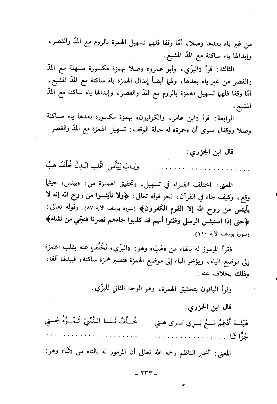 المعنى: اختلف القراء في تسهيل، وتحقيق الهمزة من: «ييئس» حيثما وقع، وكيف جاء في القرآن، نحو قوله تعالى: وَلا تَيْأَسُوا مِنْ رَوْحِ اللَّهِ إِنَّهُ لا يَيْأَسُ مِنْ رَوْحِ اللَّهِ إِلَّا الْقَوْمُ الْكافِرُونَ (سورة يوسف الآية 87). وقوله تعالى: