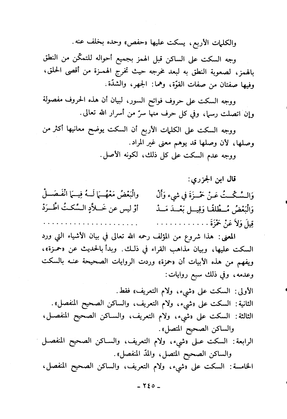 المعنى: هذا شروع من المؤلف رحمه الله تعالى في بيان الأشياء التي ورد السكت عليها، وبيان مذاهب القراء في ذلك. وبدأ بالحديث عن «حمزة»، ويفهم من هذه الأبيات أن «حمزة» وردت الروايات الصحيحة عنه بالسكت وعدمه، وفي ذلك سبع روايات: