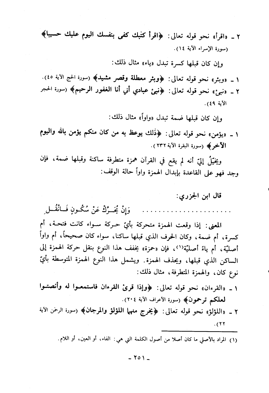 المعنى: إذا وقعت الهمزة متحركة بأيّ حركة سواء كانت فتحة، أم كسرة، أم ضمة، وكان الحرف الذي قبلها ساكنا، سواء كان صحيحا، أم واوا أصليّة، أم ياء أصليّة «1»، فإن «حمزة» يخفف هذا النوع بنقل حركة الهمزة إلى الساكن الذي قبلها، ويحذف الهمزة. ويشمل هذا النوع الهمزة المتوسطة بأيّ نوع كان، والهمزة المتطرفة، مثال ذلك: