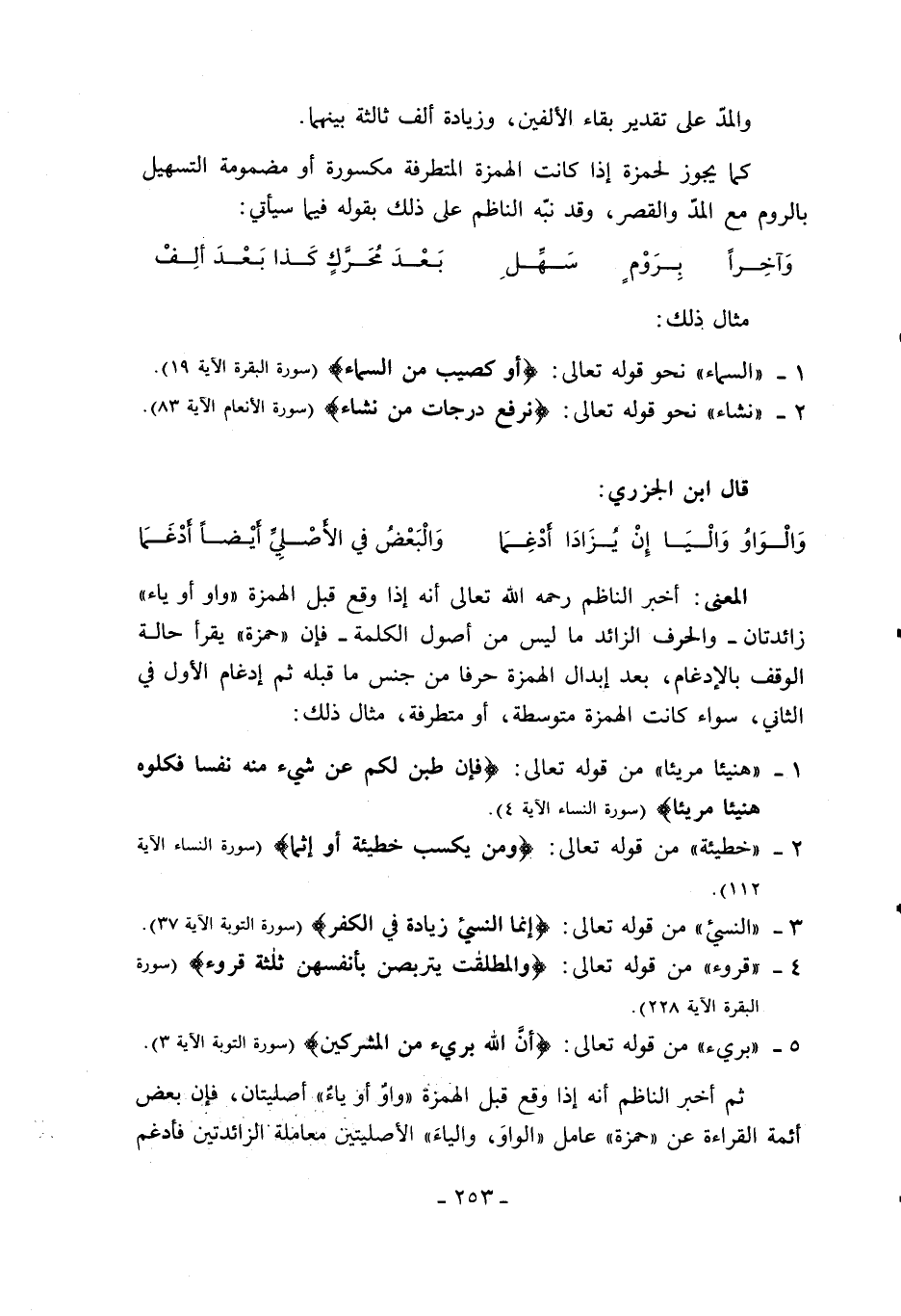 المعنى: أخبر الناظم رحمه الله تعالى أنه إذا وقع قبل الهمزة «واو أو ياء» زائدتان- والحرف الزائد ما ليس من أصول الكلمة- فإن «حمزة» يقرأ حالة الوقف بالإدغام، بعد إبدال الهمزة حرفا من جنس ما قبله ثم إدغام الأول في الثاني، سواء كانت الهمزة متوسطة، أو متطرفة، مثال ذلك:
