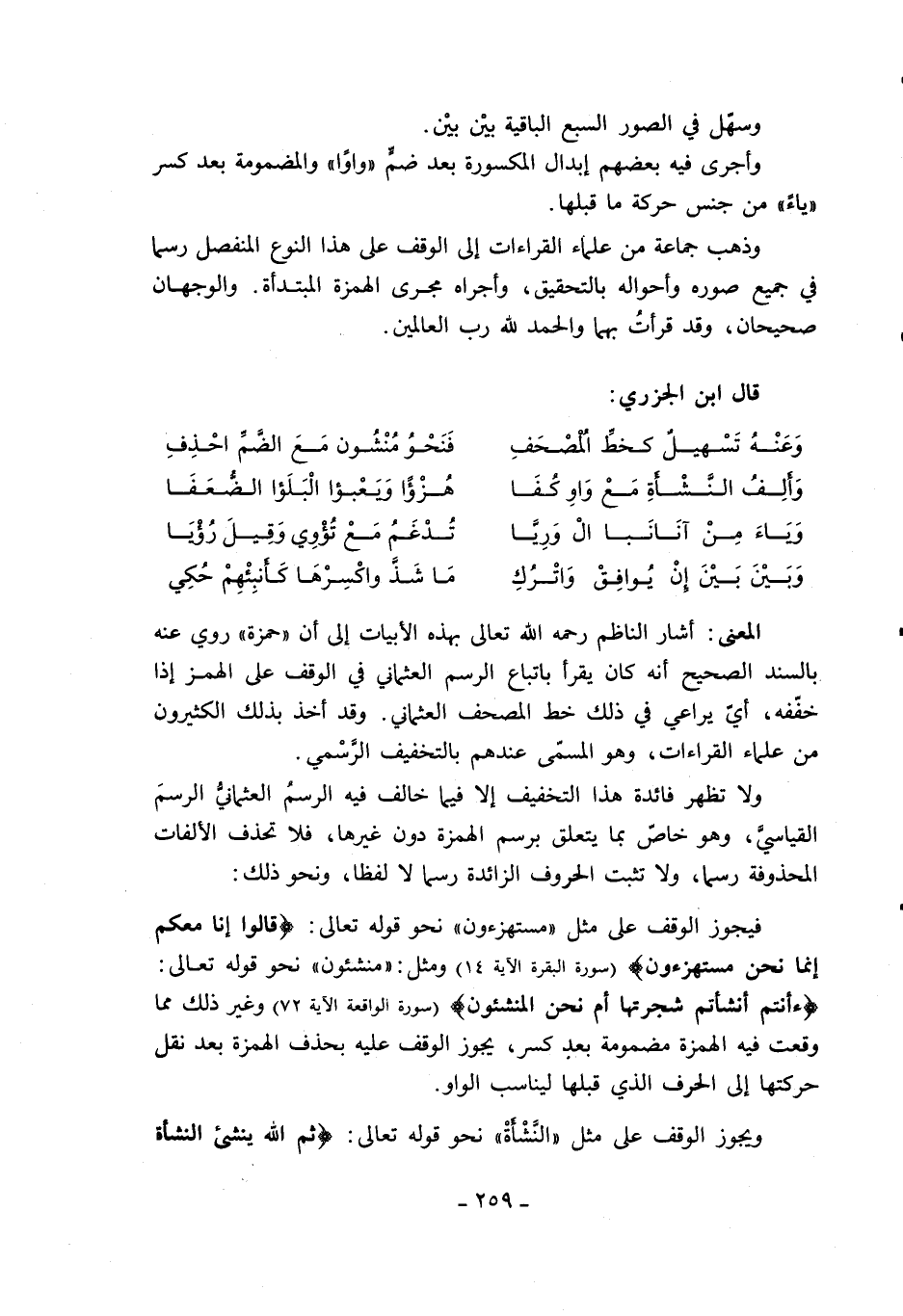 المعنى: أشار الناظم رحمه الله تعالى بهذه الأبيات إلى أن «حمزة» روي عنه بالسند الصحيح أنه كان يقرأ باتباع الرسم العثماني في الوقف على الهمز إذا خفّفه، أيّ يراعي في ذلك خط المصحف العثماني. وقد أخذ بذلك الكثيرون من علماء القراءات، وهو المسمّى عندهم بالتخفيف الرّسمي.