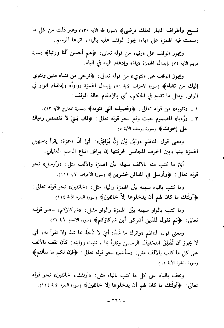 فَسَبِّحْ وَأَطْرافَ النَّهارِ لَعَلَّكَ تَرْضى (سورة طه الآية 130) وغير ذلك من كل ما رسمت فيه الهمزة على «ياء» يجوز الوقف عليه بالياء، اتباعا للرسم.