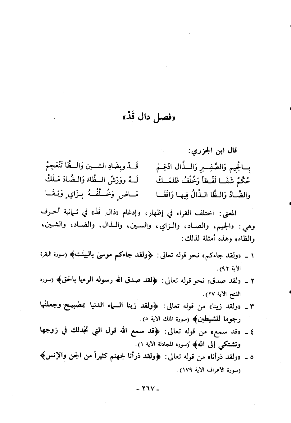 المعنى: اختلف القراء في إظهار، وإدغام «دال قد» في ثمانية أحرف وهي: «الجيم، والصاد، والزاي، والسين، والذال، والضاد، والشين، والظاء» وهذه أمثلة لذلك: