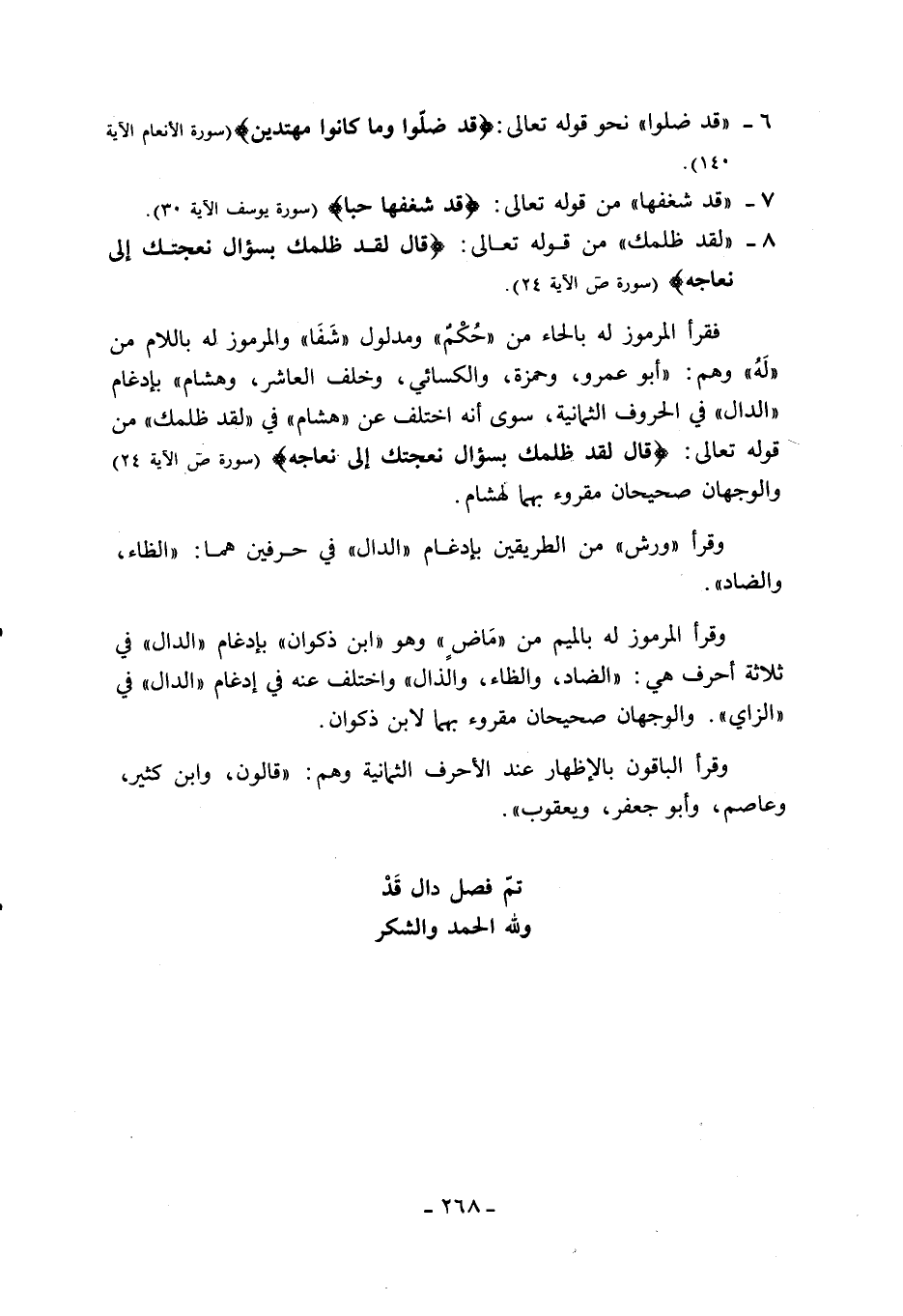 فقرأ المرموز له بالحاء من «حكم» ومدلول «شفا» والمرموز له باللام من «له» وهم: «أبو عمرو، وحمزة، والكسائي، وخلف العاشر، وهشام» بإدغام «الدال» في الحروف الثمانية، سوى أنه اختلف عن «هشام» في «لقد ظلمك» من قوله تعالى: قالَ لَقَدْ ظَلَمَكَ بِسُؤالِ نَعْجَتِكَ إِلى نِعاجِهِ (سورة ص الآية 24).