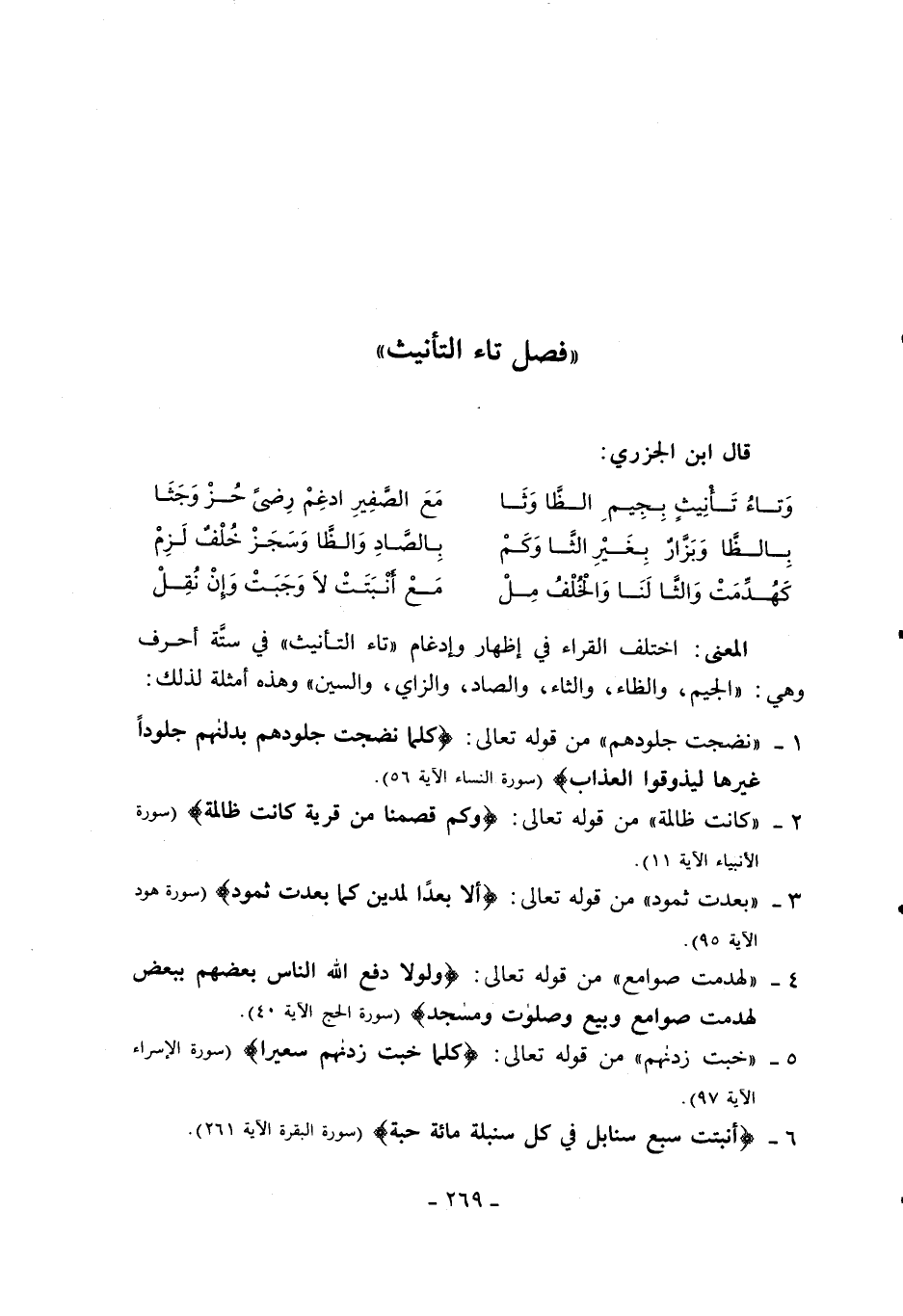 المعنى: اختلف القراء في إظهار وإدغام «تاء التأنيث» في ستّة أحرف وهي: «الجيم، والظاء، والثاء، والصاد، والزاي، والسين» وهذه أمثلة لذلك: