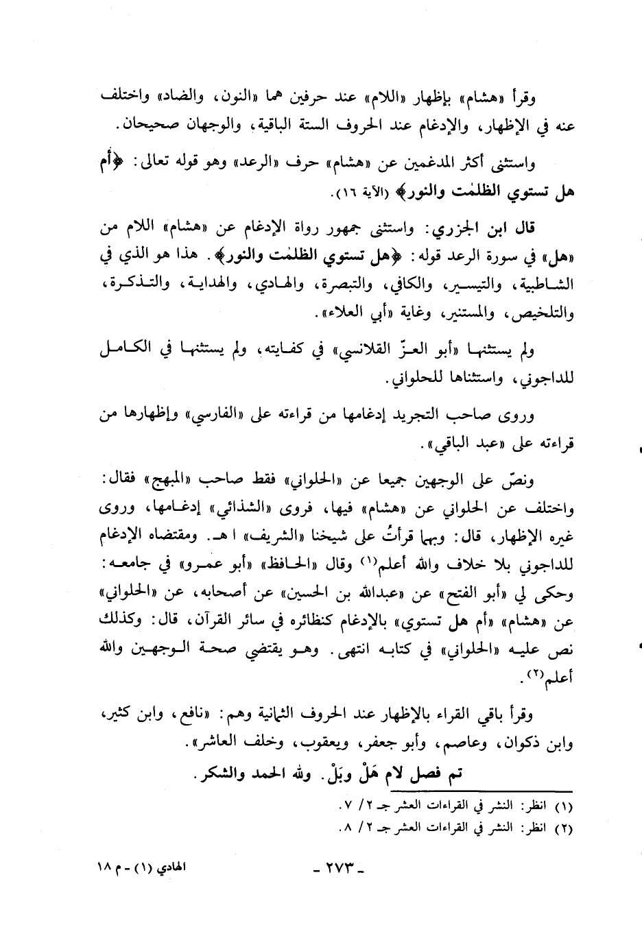 قال ابن الجزري: واستثنى جمهور رواة الإدغام عن «هشام» اللام من «هل» في سورة الرعد قوله: هَلْ تَسْتَوِي الظُّلُماتُ وَالنُّورُ. هذا هو الذي في الشاطبية، والتيسير، والكافي، والتبصرة، والهادي، والهداية، والتذكرة، والتلخيص، والمستنير، وغاية «أبي العلاء».