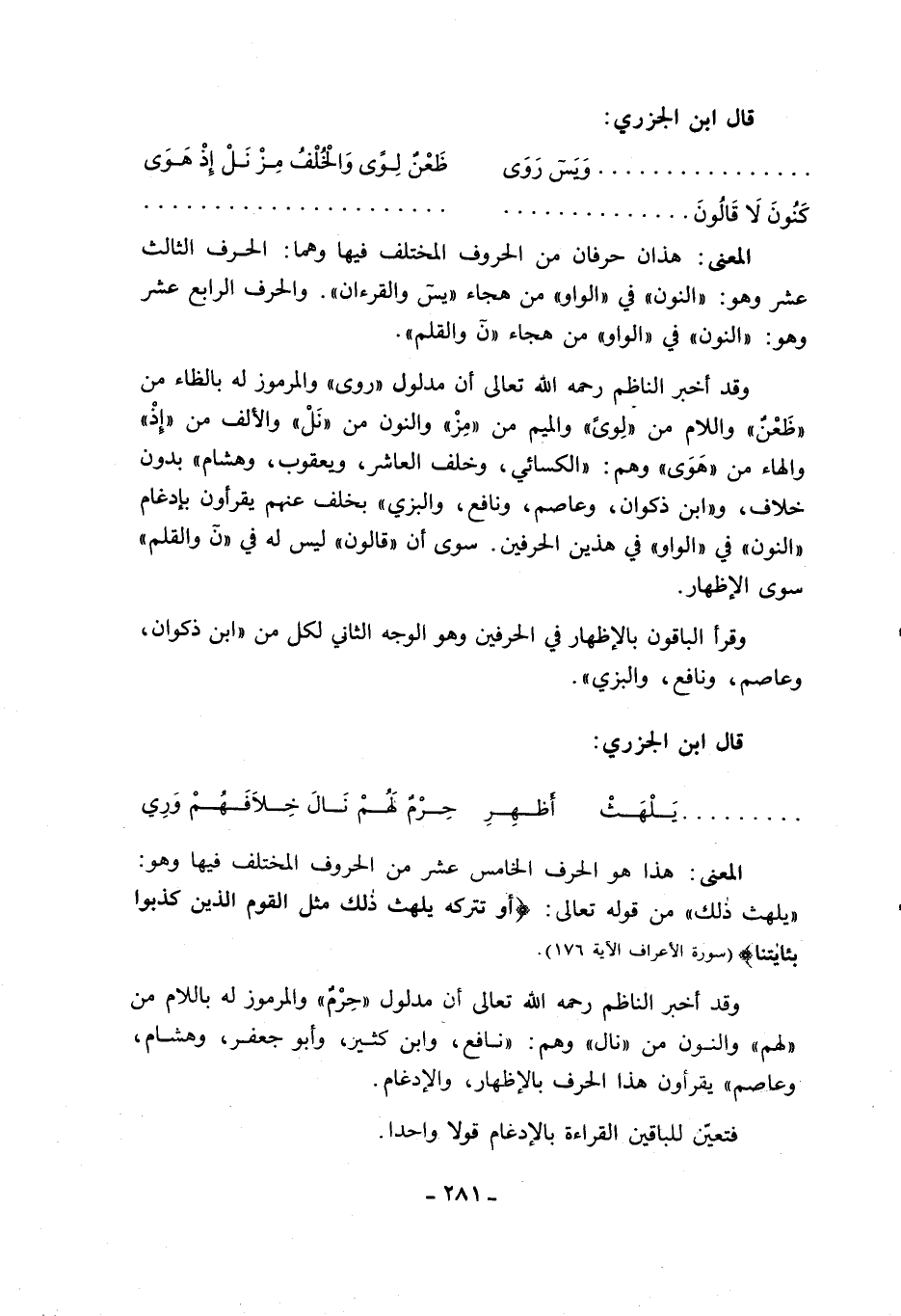 وقد أخبر الناظم رحمه الله تعالى أن مدلول «روى» والمرموز له بالظاء من «ظعن» واللام من «لوى» والميم من «مز» والنون من «نل» والألف من «إذ» والهاء من «هوى» وهم: «الكسائي، وخلف العاشر، ويعقوب، وهشام» بدون خلاف، و «ابن ذكوان، وعاصم، ونافع، والبزي» بخلف عنهم يقرءون بإدغام «النون» في «الواو» في هذين الحرفين. سوى أن «قالون» ليس له في «ن والقلم» سوى الإظهار.