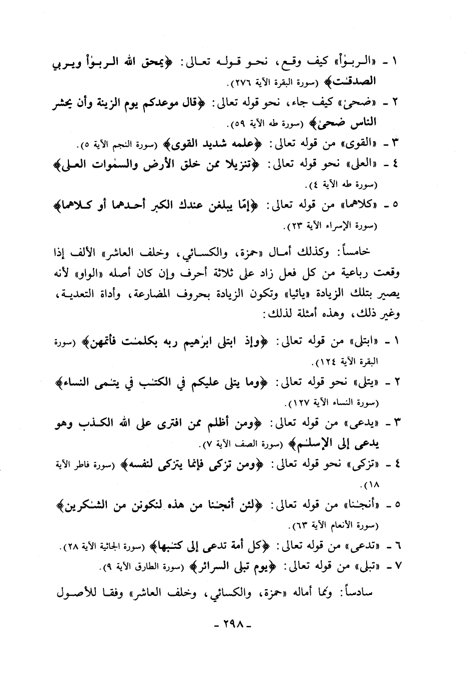 خامسا: وكذلك أمال «حمزة، والكسائي، وخلف العاشر» الألف إذا وقعت رباعية من كل فعل زاد على ثلاثة أحرف وإن كان أصله «الواو» لأنه يصير بتلك الزيادة «يائيا» وتكون الزيادة بحروف المضارعة، وأداة التعدية، وغير ذلك، وهذه أمثلة لذلك: