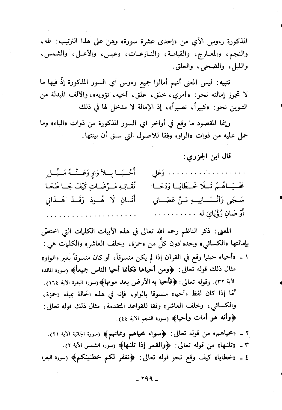 تنبيه: ليس المعنى أنهم أمالوا جميع رءوس أي السور المذكورة إذ فيها ما لا تجوز إمالته نحو: «أمري، خلق، علق، أخيه، تؤويه»، والألف المبدلة من التنوين نحو: «كبيرا، نصيرا»، إذ الإمالة لا مدخل لها في ذلك.