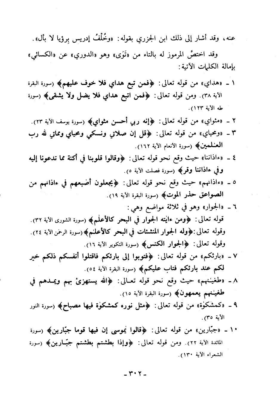وقد اختصّ المرموز له بالتاء من «توى» وهو «الدوري» عن «الكسائي» بإمالة الكلمات الآتية: