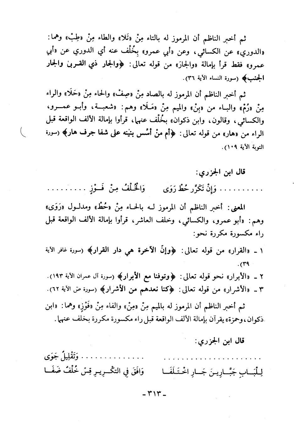 «الدوري» عن الكسائي، وعن «أبي عمرو» بخلف عنه أي الدوري عن «أبي عمرو» فقط قرأ بإمالة «والجار» من قوله تعالى: وَالْجارِ ذِي الْقُرْبى وَالْجارِ الْجُنُبِ (سورة النساء الآية 36).