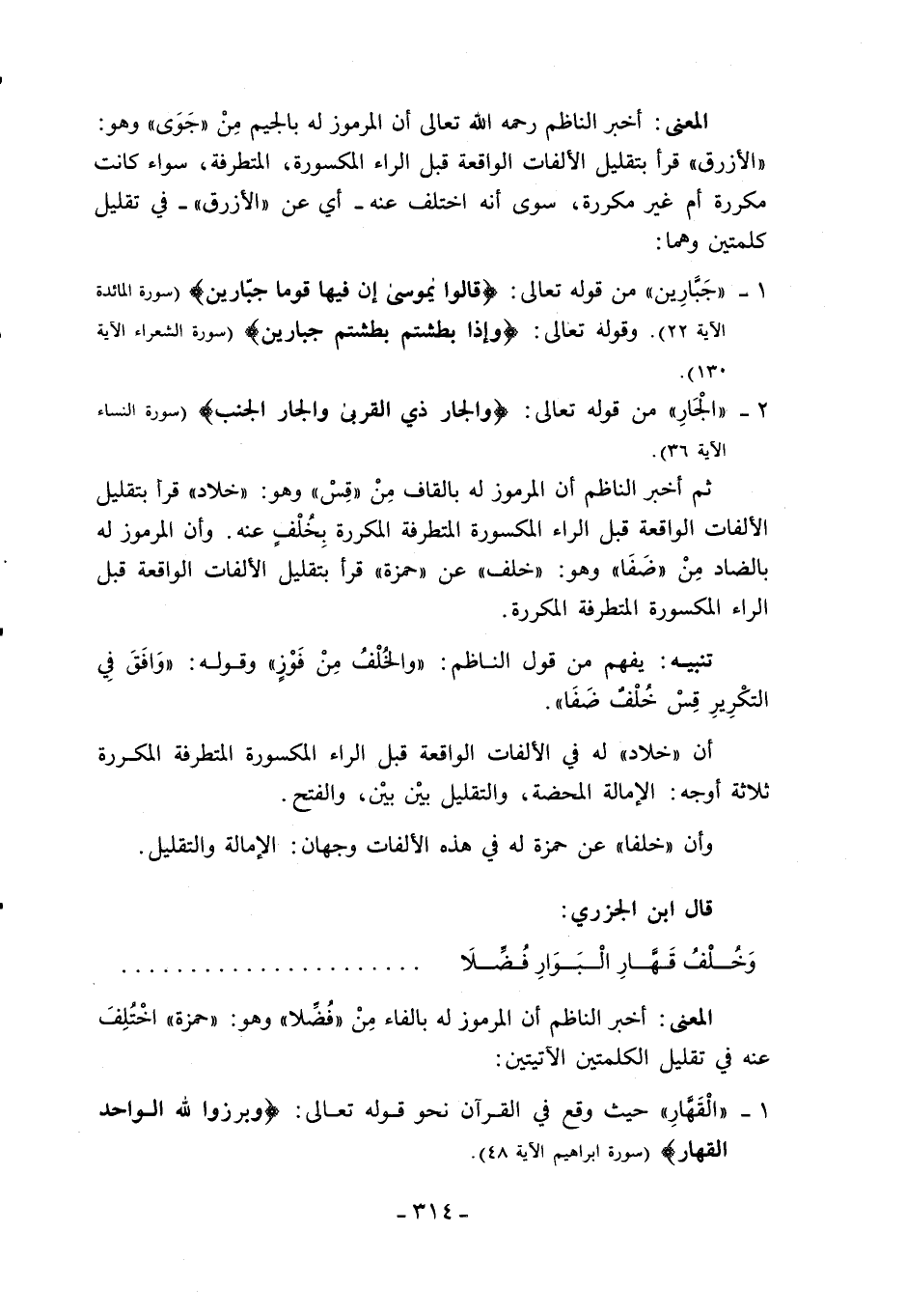 ثم أخبر الناظم أن المرموز له بالقاف من «قس» وهو: «خلاد» قرأ بتقليل الألفات الواقعة قبل الراء المكسورة المتطرفة المكررة بخلف عنه. وأن المرموز له بالضاد من «ضفا» وهو: «خلف» عن «حمزة» قرأ بتقليل الألفات الواقعة قبل الراء المكسورة المتطرفة المكررة.