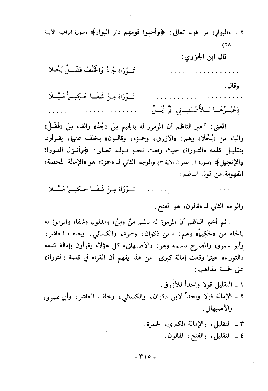 المعنى: أخبر الناظم أن المرموز له بالجيم من «جد» والفاء من «فضل» والباء من «بجّلا» وهم: «الأزرق، وحمزة، وقالون» بخلف عنهما، يقرءون بتقليل كلمة «التوراة» حيث وقعت نحو قوله تعالى: وَأَنْزَلَ التَّوْراةَ وَالْإِنْجِيلَ (سورة آل عمران الآية 3) والوجه الثاني ل «حمزة» هو «الإمالة المحضة» المفهومة من قول الناظم:
