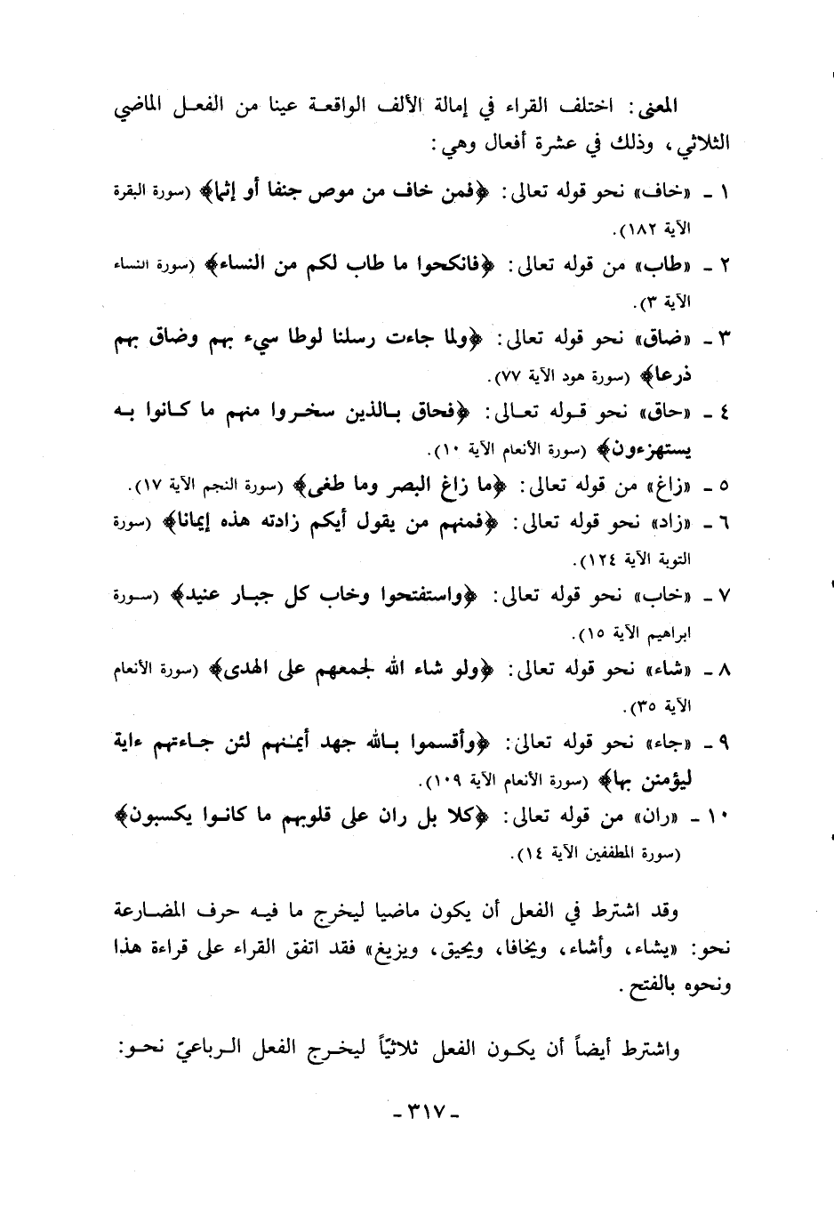 المعنى: اختلف القراء في إمالة الألف الواقعة عينا من الفعل الماضي الثلاثي، وذلك في عشرة أفعال وهي: